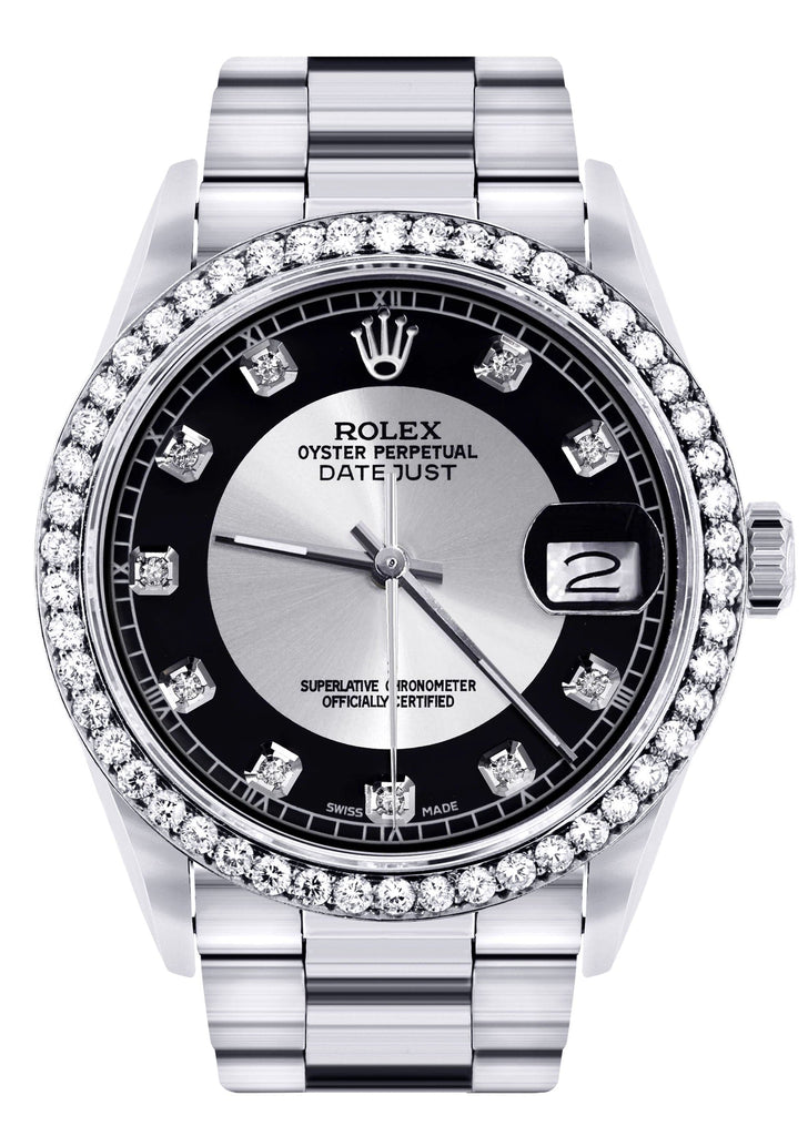 Iced Out Rolex Datejust 36 MM | Stainless Steel | 10 Carats of Diamonds | Black Roman Diamond Dial | Oyster Band