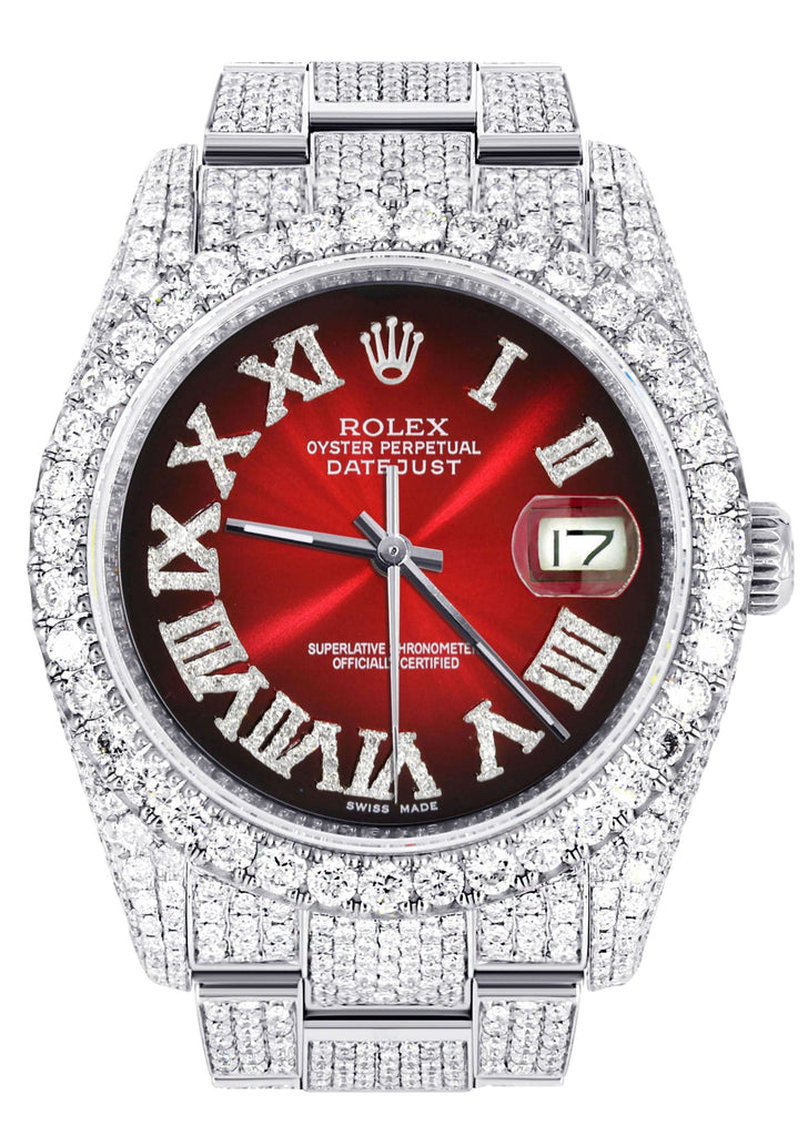 Iced Out Rolex Datejust 36 MM | Stainless Steel | 16.5 Carats of Diamonds | Red Black Roman Diamond Dial | Oyster Band | Model 116200