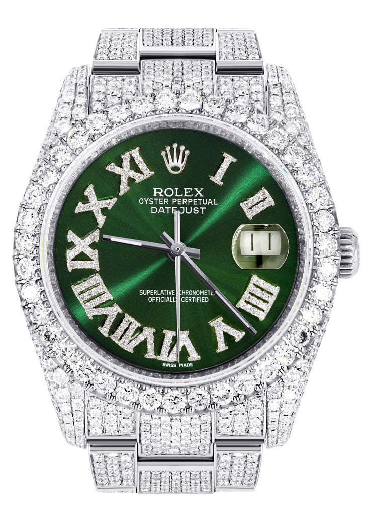 Iced Out Rolex Datejust 36 MM | Stainless Steel | 16.5 Carats of Diamonds | Green Roman Diamond Dial | Oyster Band | Model 116200
