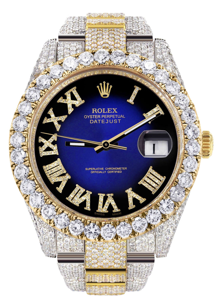 Diamond Iced Out Rolex Datejust 41 | 25 Carats Of Diamonds | Custom Blue Black Roman Numeral Diamond Dial | Two Tone | Two Row | Oyster Band