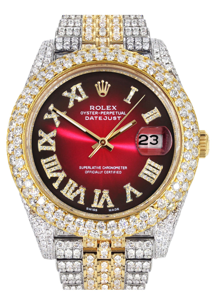 Diamond Iced Out Rolex Datejust 41 | 25 Carats Of Diamonds | Custom Red Roman Numeral Diamond Dial | Two Row | Oyster Band