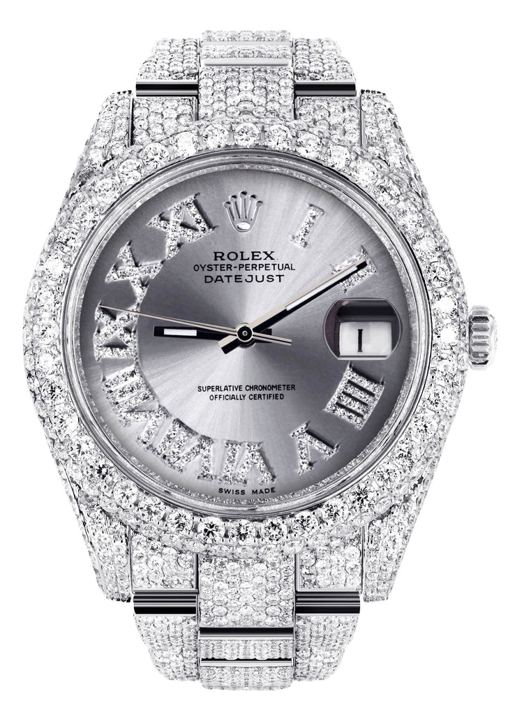 Diamond Iced Out Rolex Datejust 41 | 25 Carats Of Diamonds | Custom Silver Roman Numeral Diamond Dial | Two Row | Oyster Band