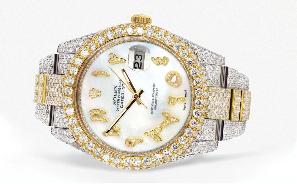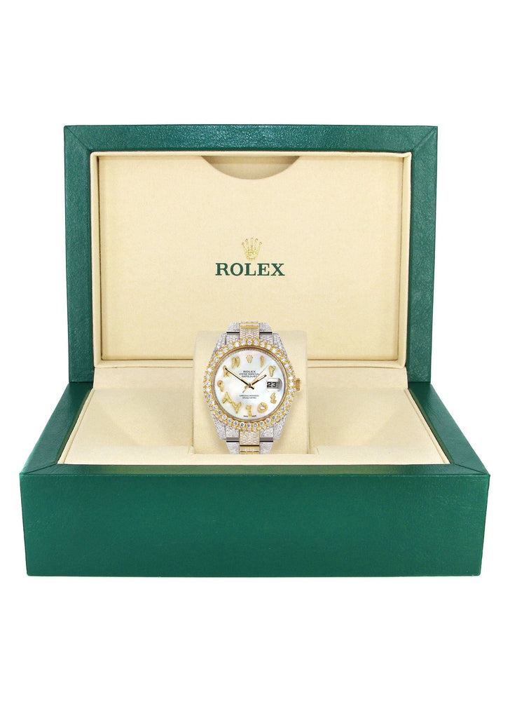 Diamond Iced Out Rolex Datejust 41 | 25 Carats Of Diamonds | Custom Mother of Pearl Arabic Numeral Diamond Dial | Two Tone | Two Row | Oyster Band