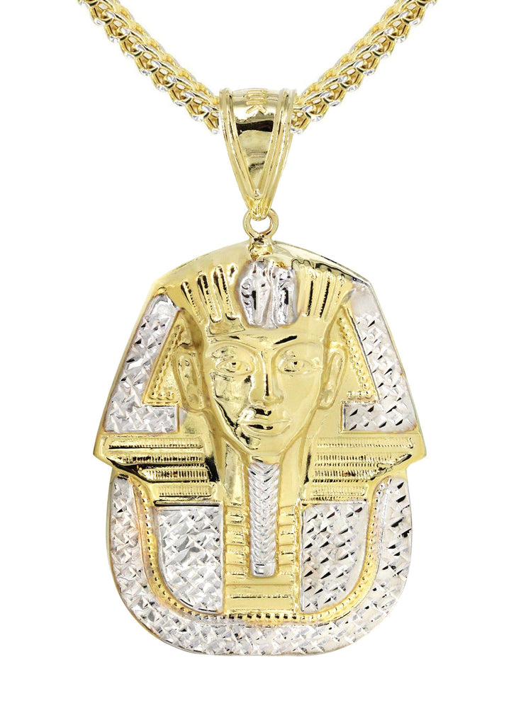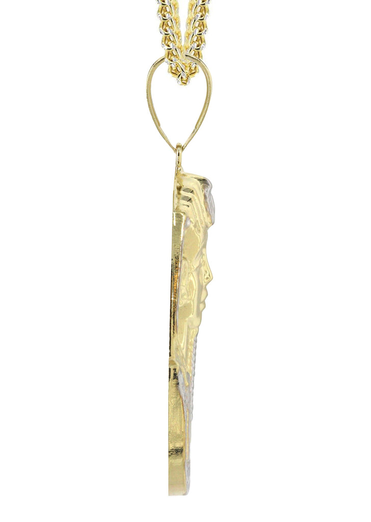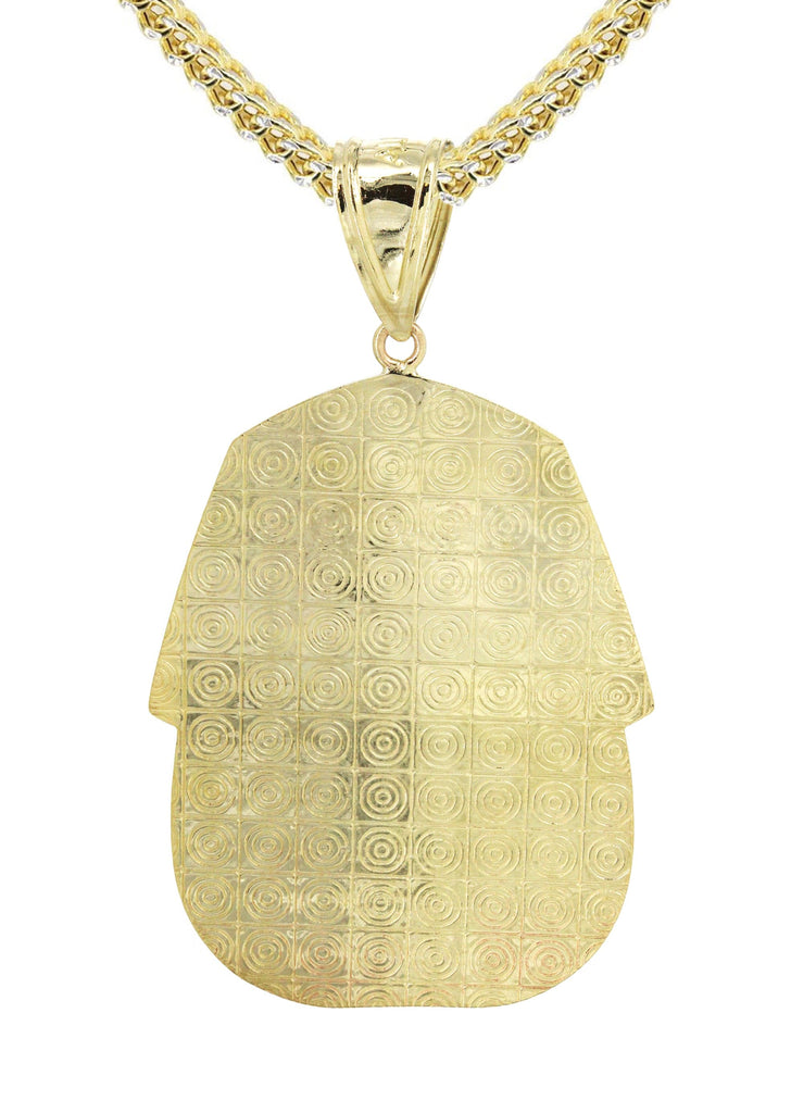 Franco Link Chain And Nefertiti Pendant With An Approximate Total Gram Weight Of 17.4. Pendant Weighs 7.4 Grams And The Chain Weighs 10 Grams. The Pendant Measurement Is 1.3 Inches In Width And A Length Of 2.4 Inches. The Width Of The Chain Is 3 Mm And The Length Of The Chain Can Be Adjusted.