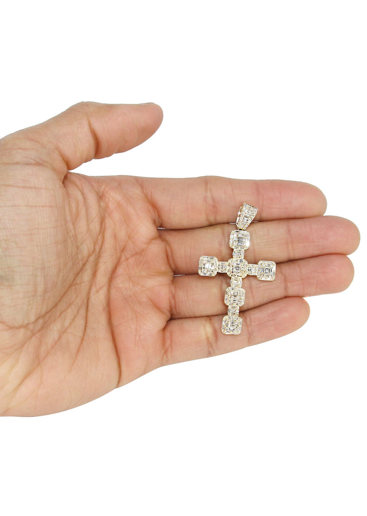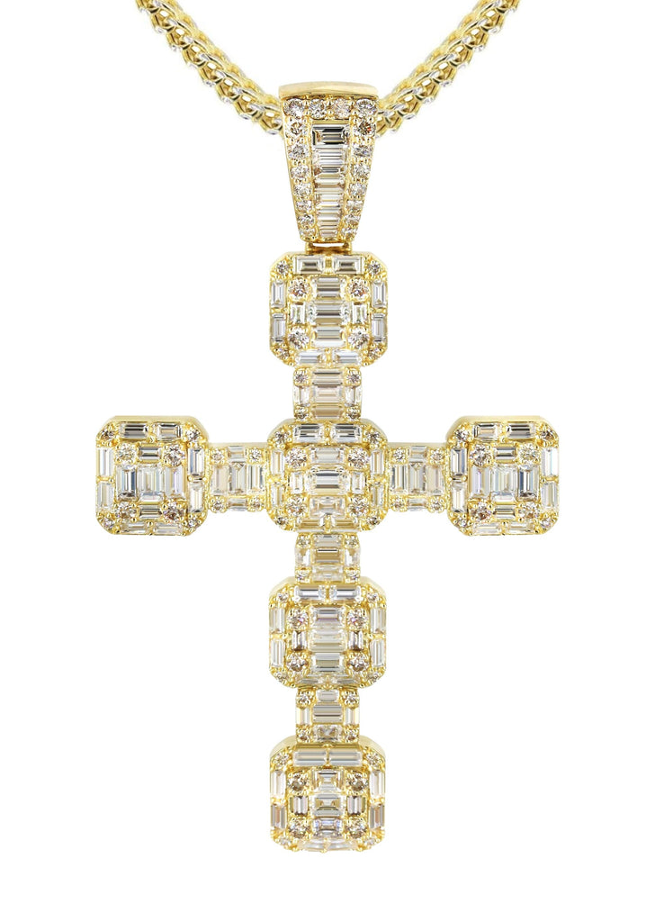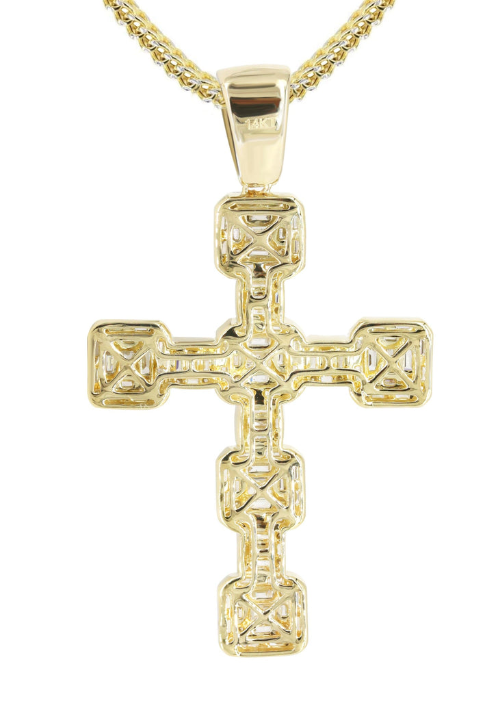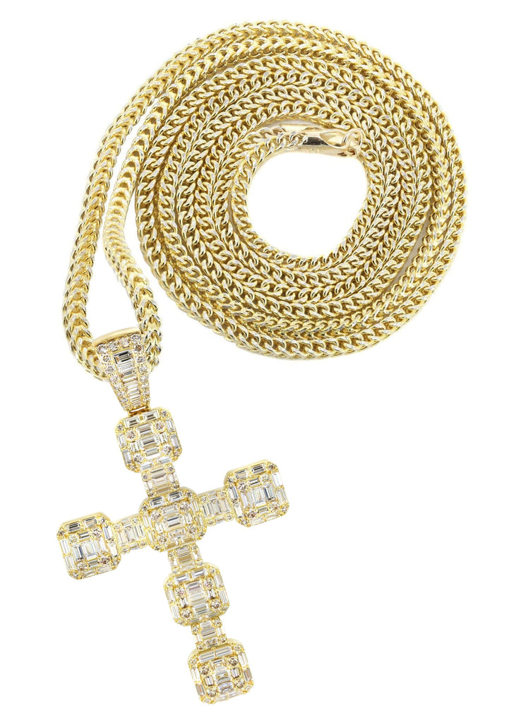 | 14k yellow gold diamond cross pendant & franco chain which comes in 1.9 Inches in length and 1.1 Inches in width. The pendant weights appx 7 grams has 2.68 Carats of Vs quality diamonds. The chain options include a gold cuban chain, franco or rope with a width of 3mm's and the length can be selected to any preference. |
