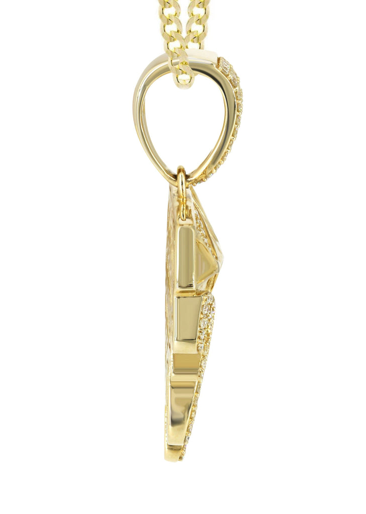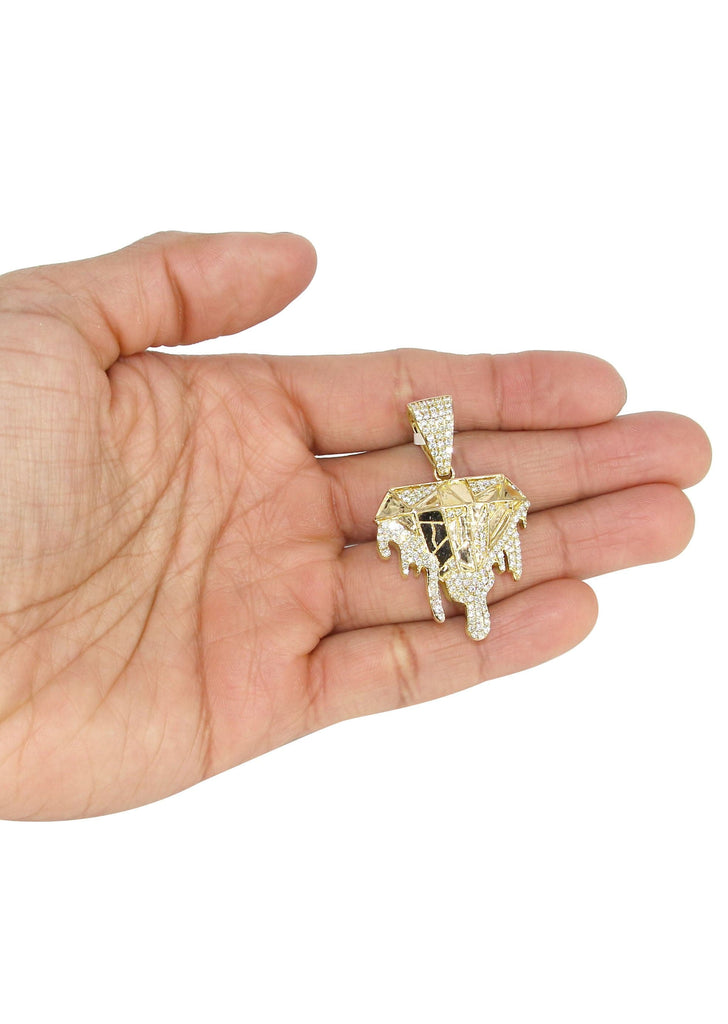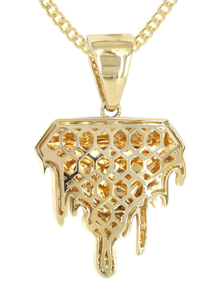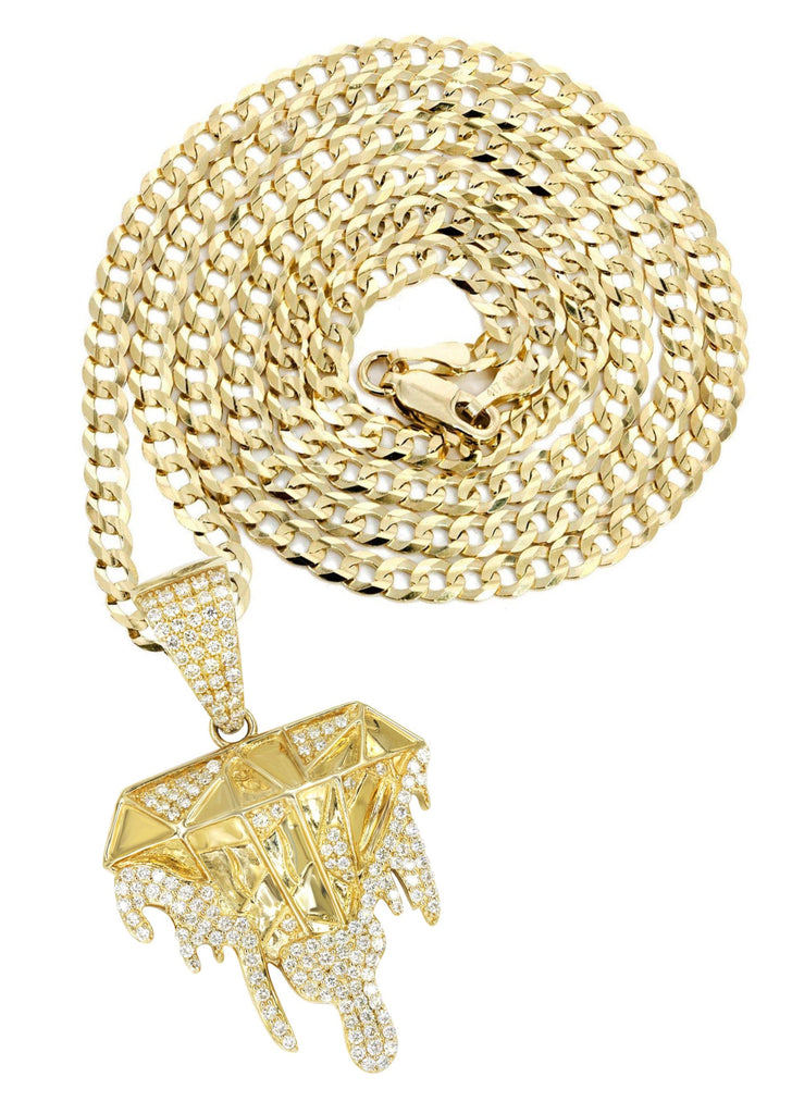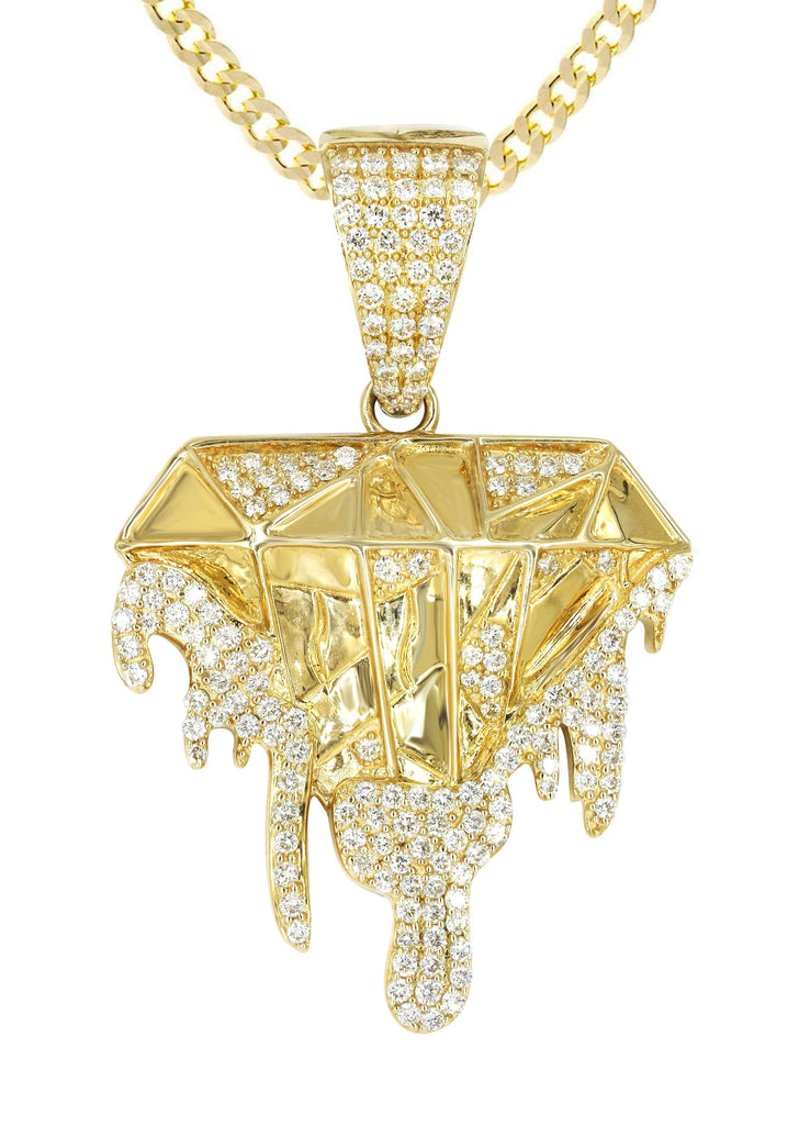 | 14k yellow gold diamond drip pendant & cuban chain which comes in 1.8 Inches in length and 1.2 Inches in width. The pendant weights appx 15.5 grams has 1.85 Carats of Vs quality diamonds. The chain options include a gold cuban chain, franco or rope with a width of 3mm's and the length can be selected to any preference. |