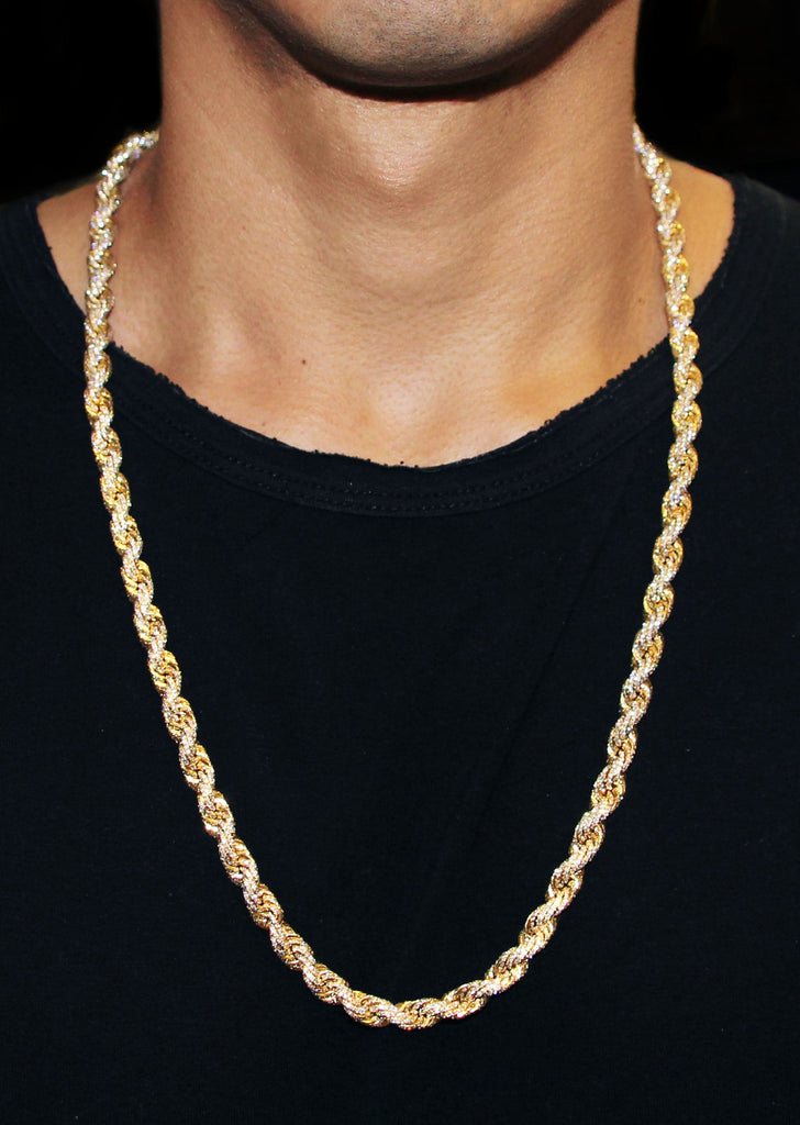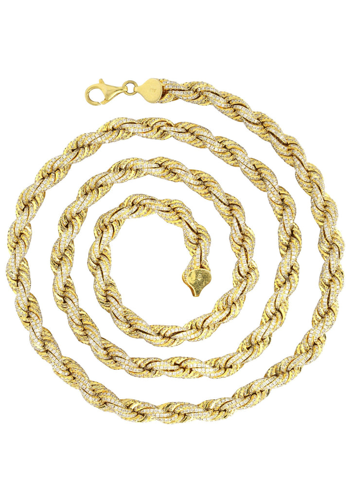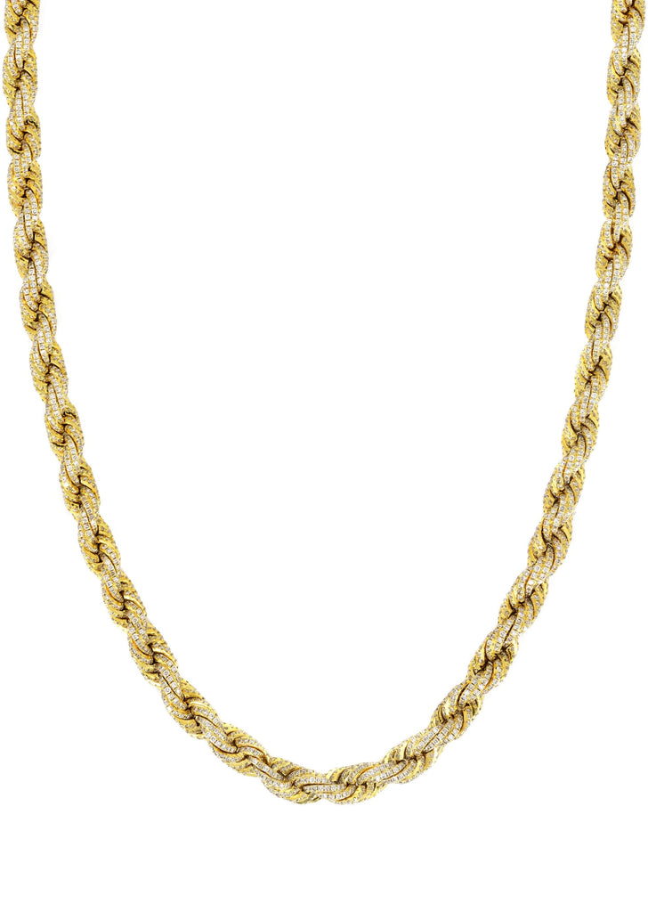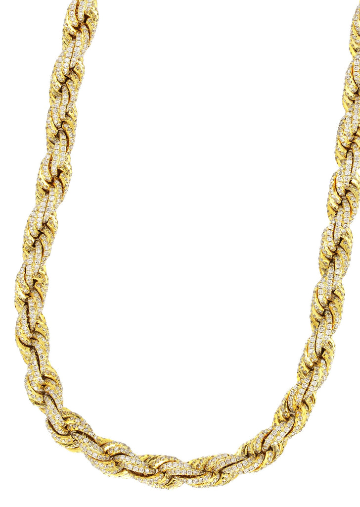 10K Iced Out Diamond Rope Chain. You can pick your length above. Once you selected your length, you can see the adjusted gram weight above the price. The quality of the diamonds are VS Clarity and G/H Color.