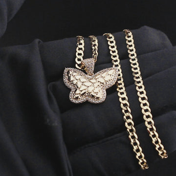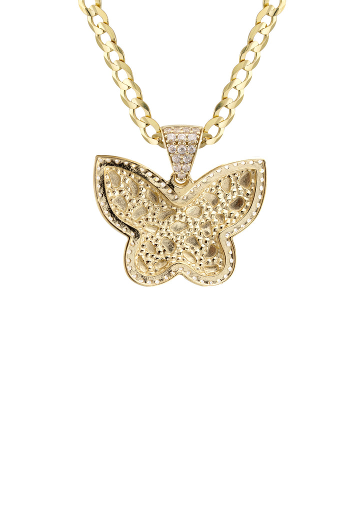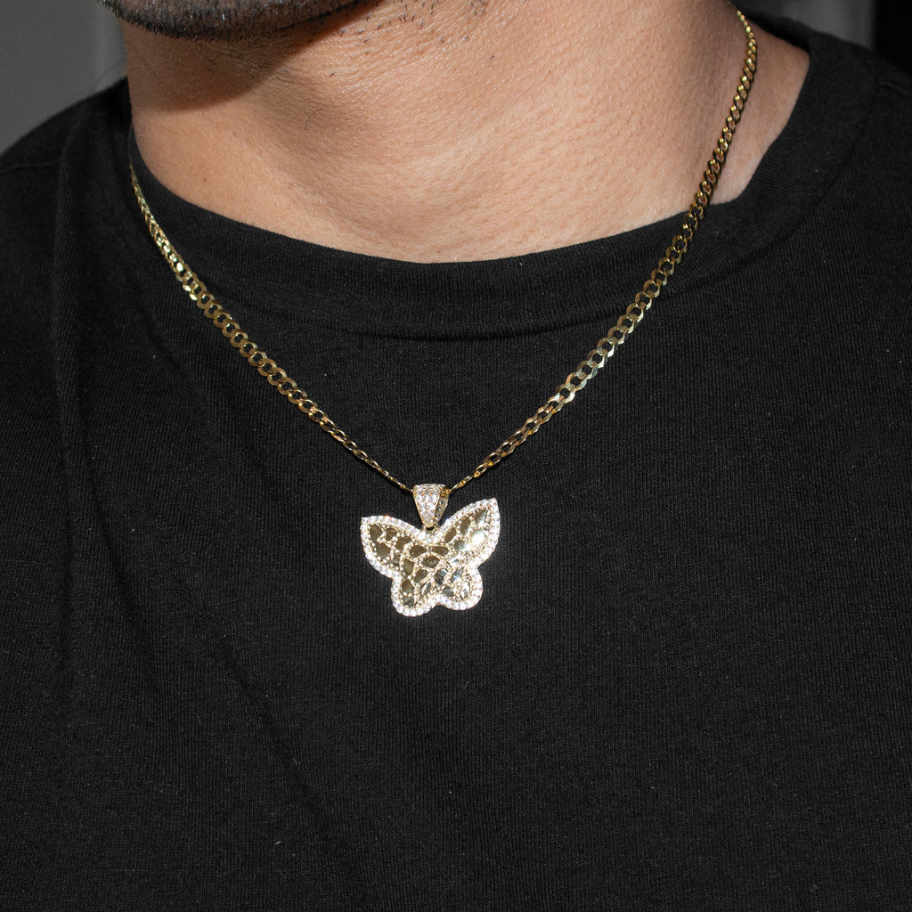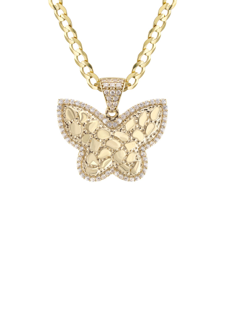 10K Yellow Gold Butterfly Nugget Necklace Encrusted With Cubic Zirconia Crystals With An Approximate Total Gram Weight Of 9.5. Pendant Weighs 3.4 Grams And The Chain Weighs 7 Grams. The Pendant Measurement Is 1 inches In Width And A Length Of 1 inches. The Length And Type Of The Chain Can Be Adjusted Or Select The No Chain Option.
