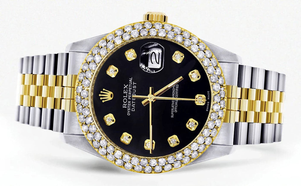 Diamond Gold Rolex Watch For Men 16233 | 36Mm | Black Dial | Two Row 4.25 Carat Bezel | Jubilee Band