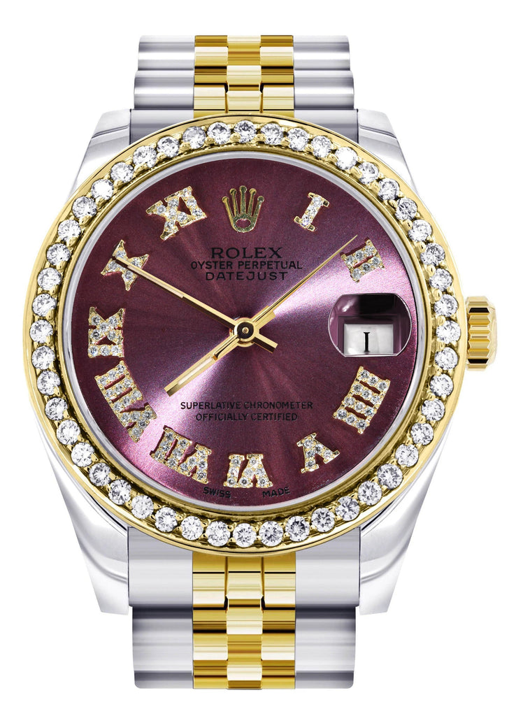 Diamond Gold Rolex Watch | 68273 |Diamond Bezel | 31MM | Purple Roman Numeral Diamond Dial | Jubilee Band
