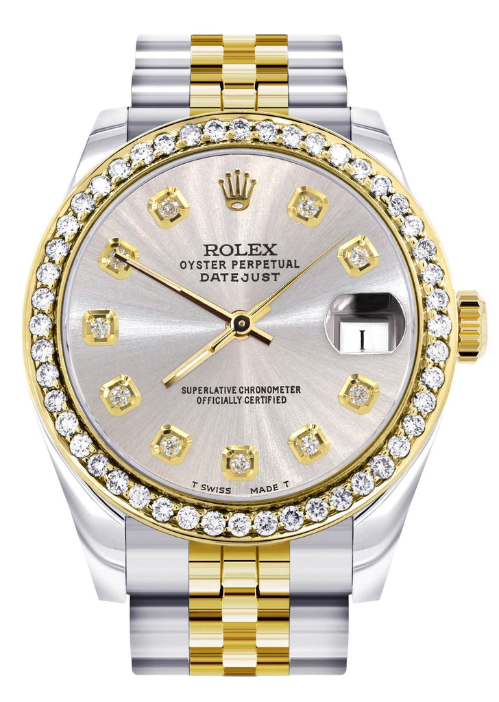 Diamond Gold Rolex Watch | 68273 | Diamond Bezel | 31MM | Grey Dial | Jubilee Band