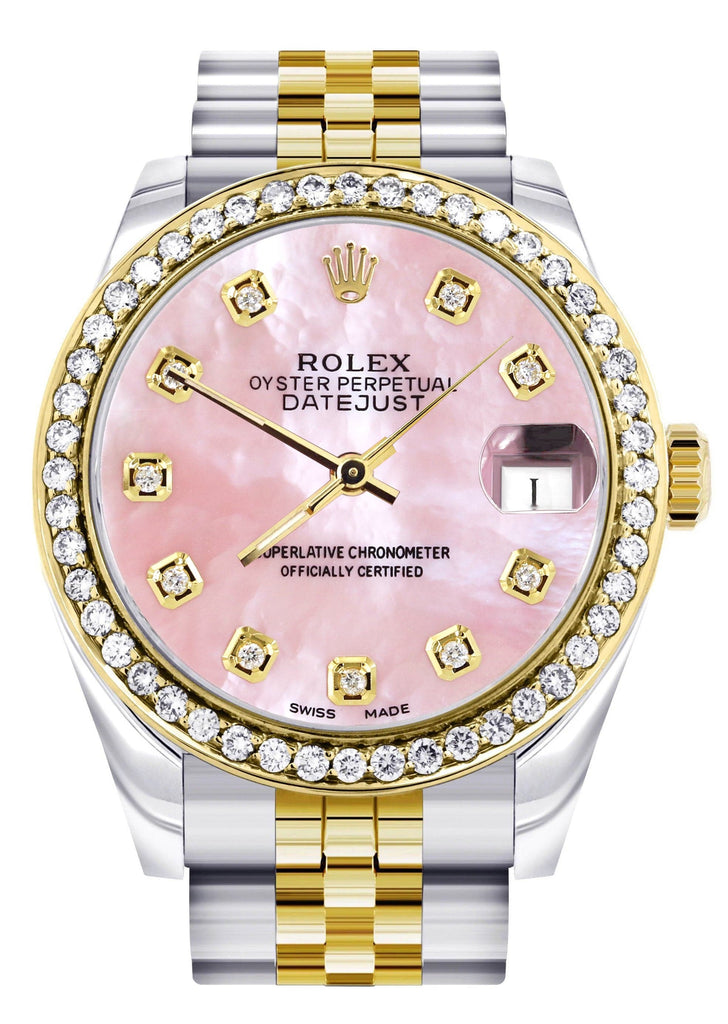 Diamond Gold Rolex Watch | 68273 | Diamond Bezel | 31MM | Pink Mother Of Pearl Dial | Jubilee Band