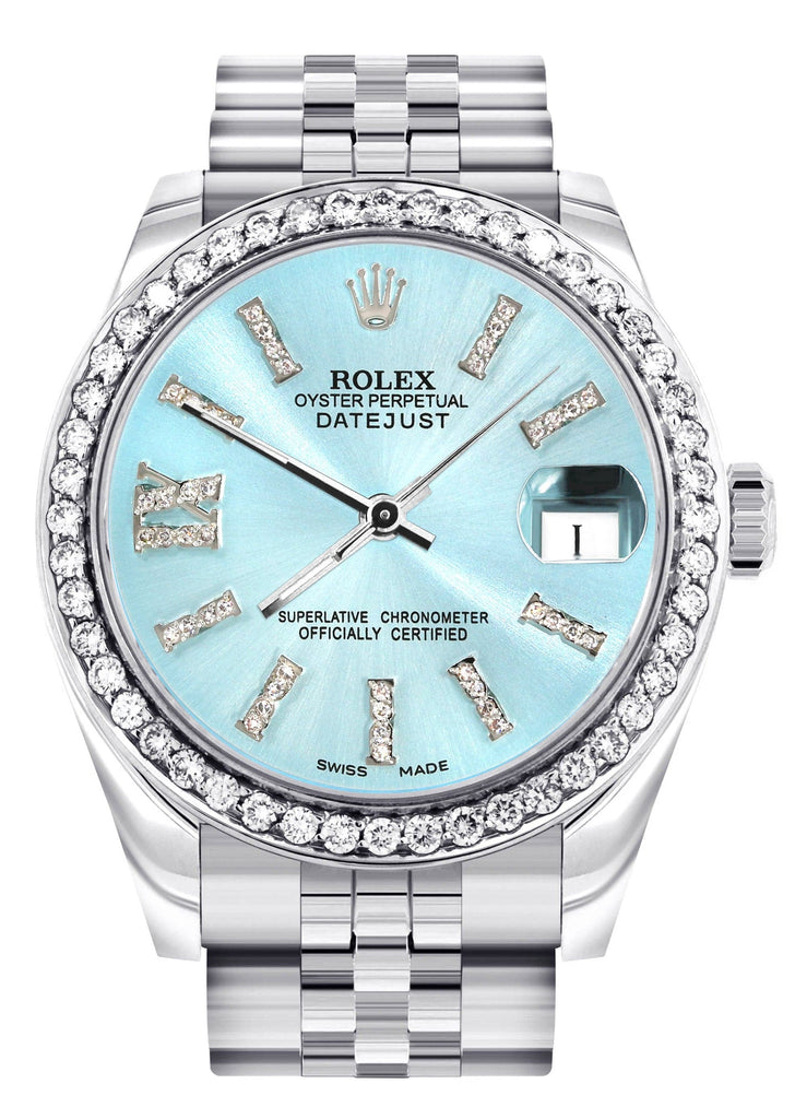Diamond Rolex Watch | 68274 | Diamond Bezel | 31MM | Light Blue Roman Diamond Dial | Jubilee Band