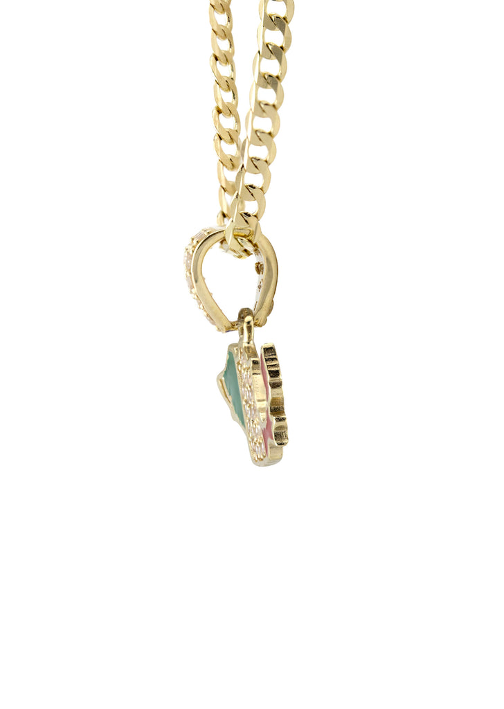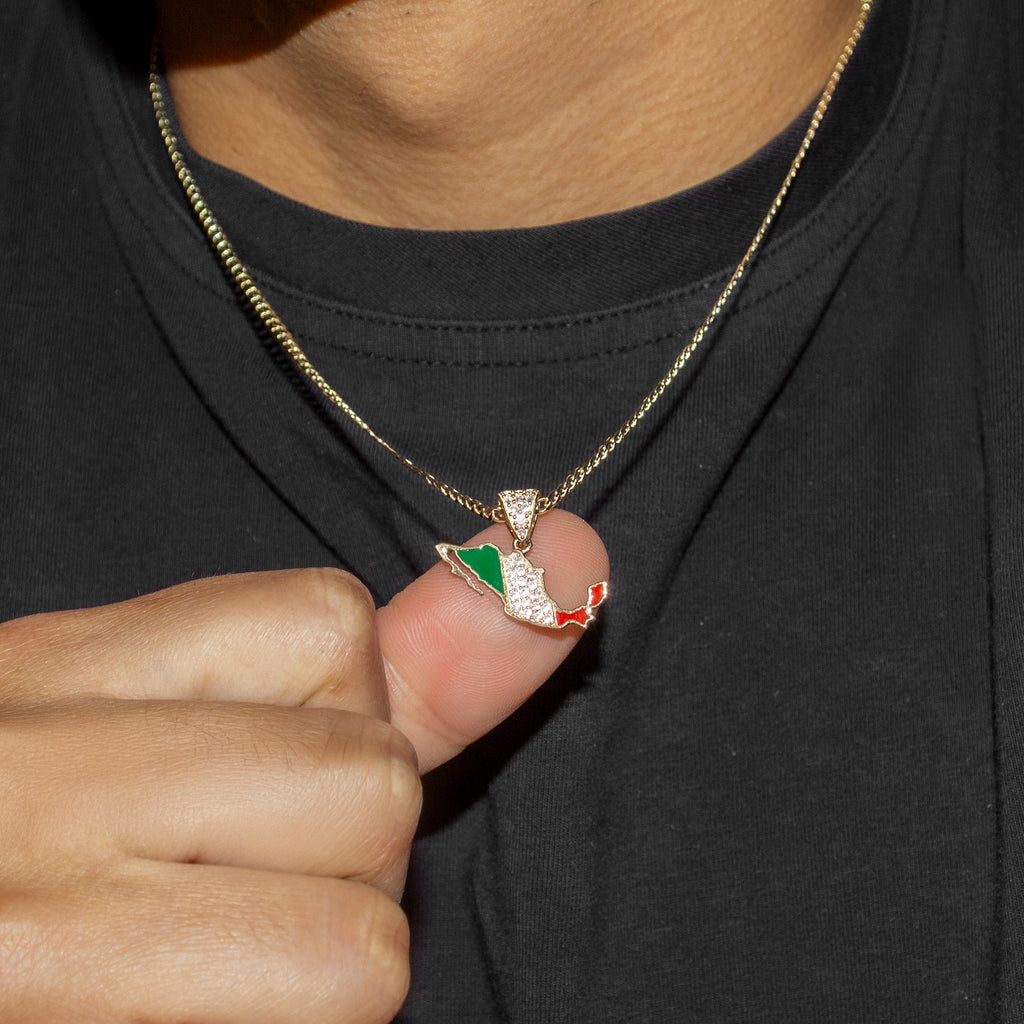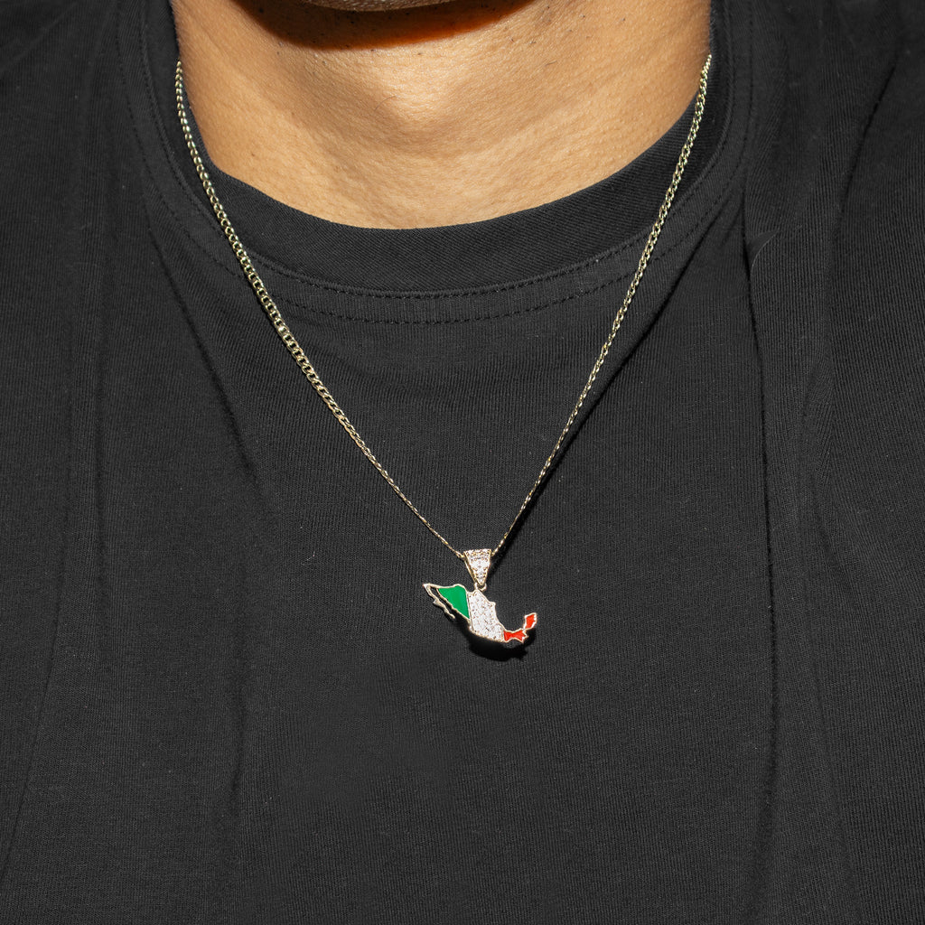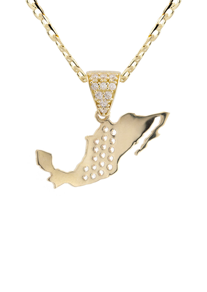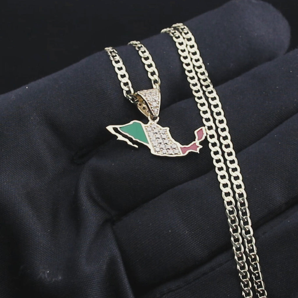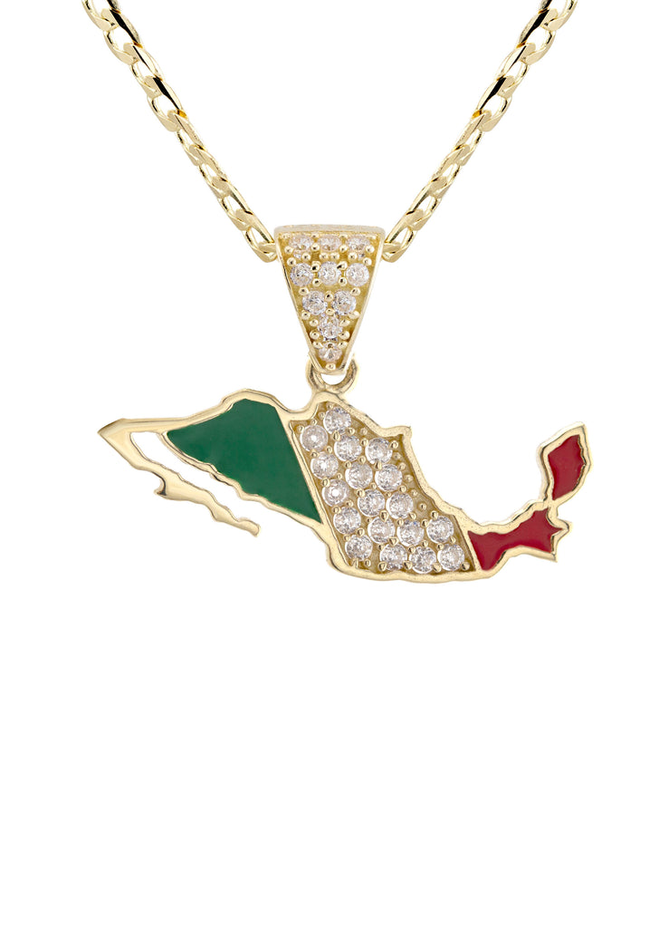 10K Yellow Gold Mexico Necklace Encrusted With Cubic Zirconia Crystals With An Approximate Total Gram Weight Of 5.3. Pendant Weighs 1.3 Grams And The Chain Weighs 4 Grams. The Pendant Measurement Is 0.9 inches In Width And A Length Of 0.7 inches. The Length And Type Of The Chain Can Be Adjusted Or Select The No Chain Option.