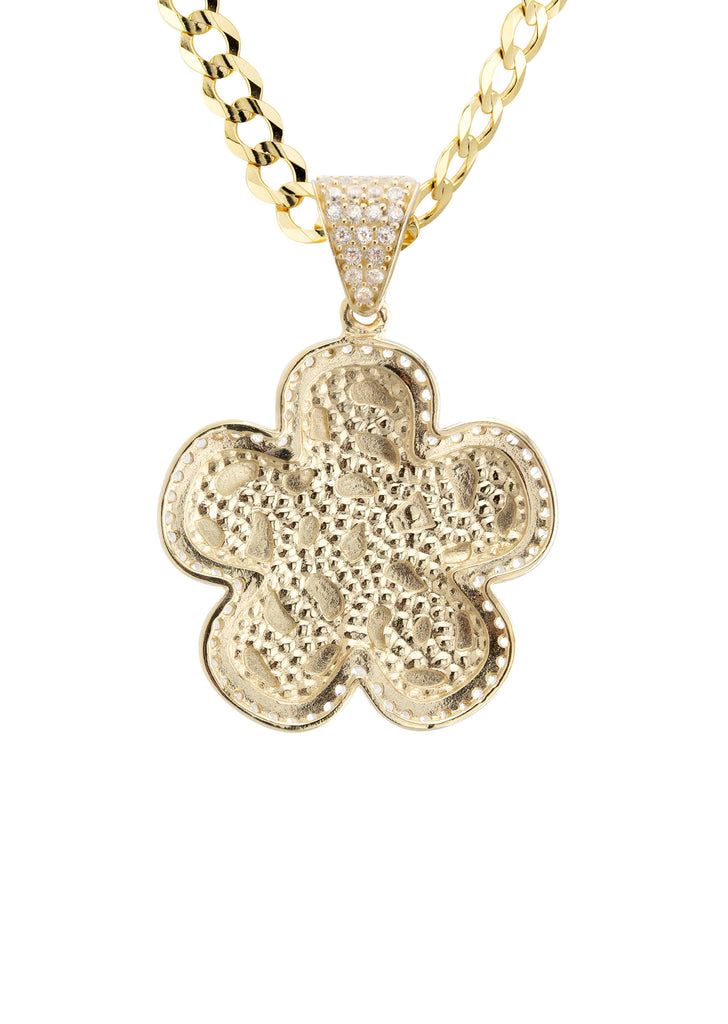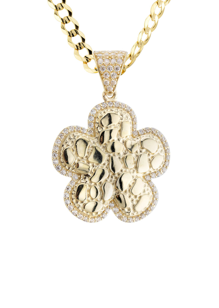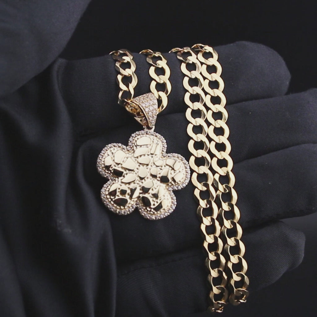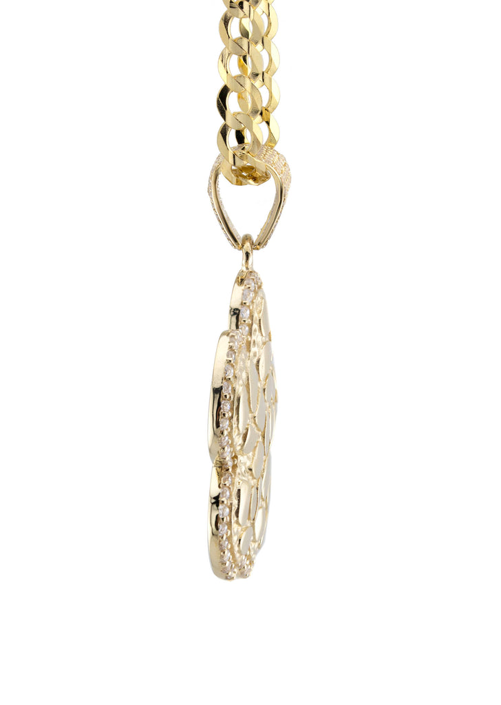 10K Yellow Gold Nugget Necklace Encrusted With Cubic Zirconia Crystals With An Approximate Total Gram Weight Of 18. Pendant Weighs 4 Grams And The Chain Weighs 14 Grams. The Pendant Measurement Is 1 inches In Width And A Length Of 1.4 inches. The Length And Type Of The Chain Can Be Adjusted Or Select The No Chain Option.
