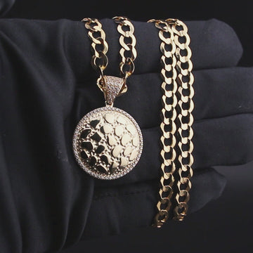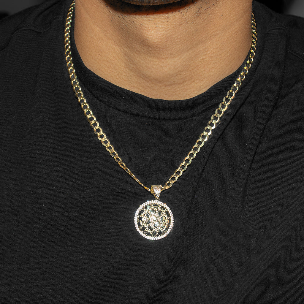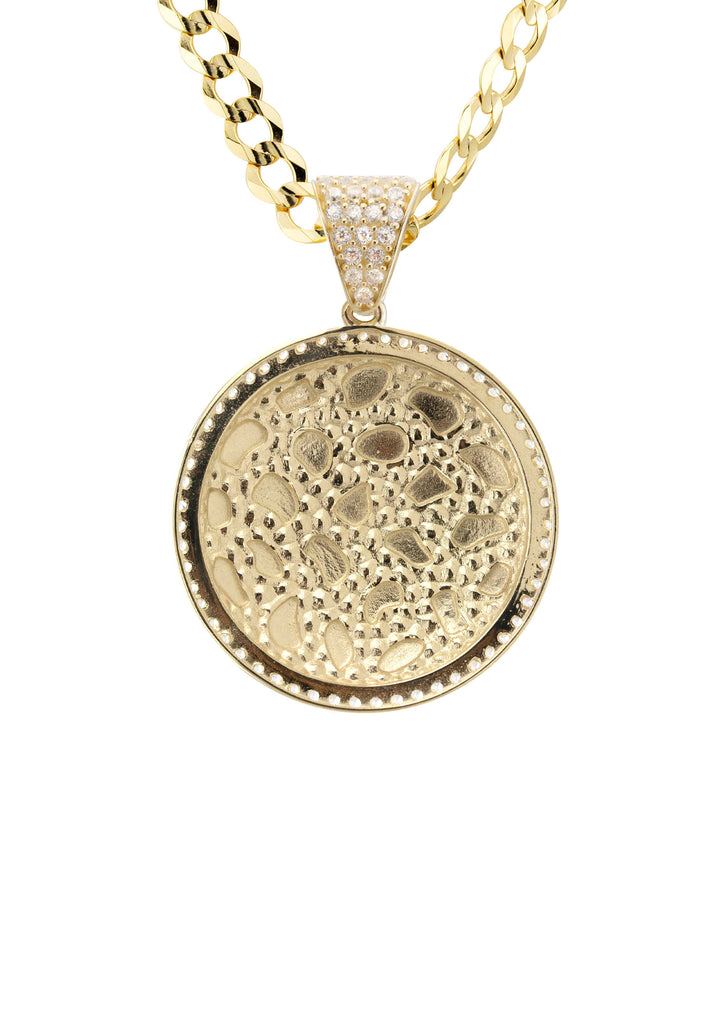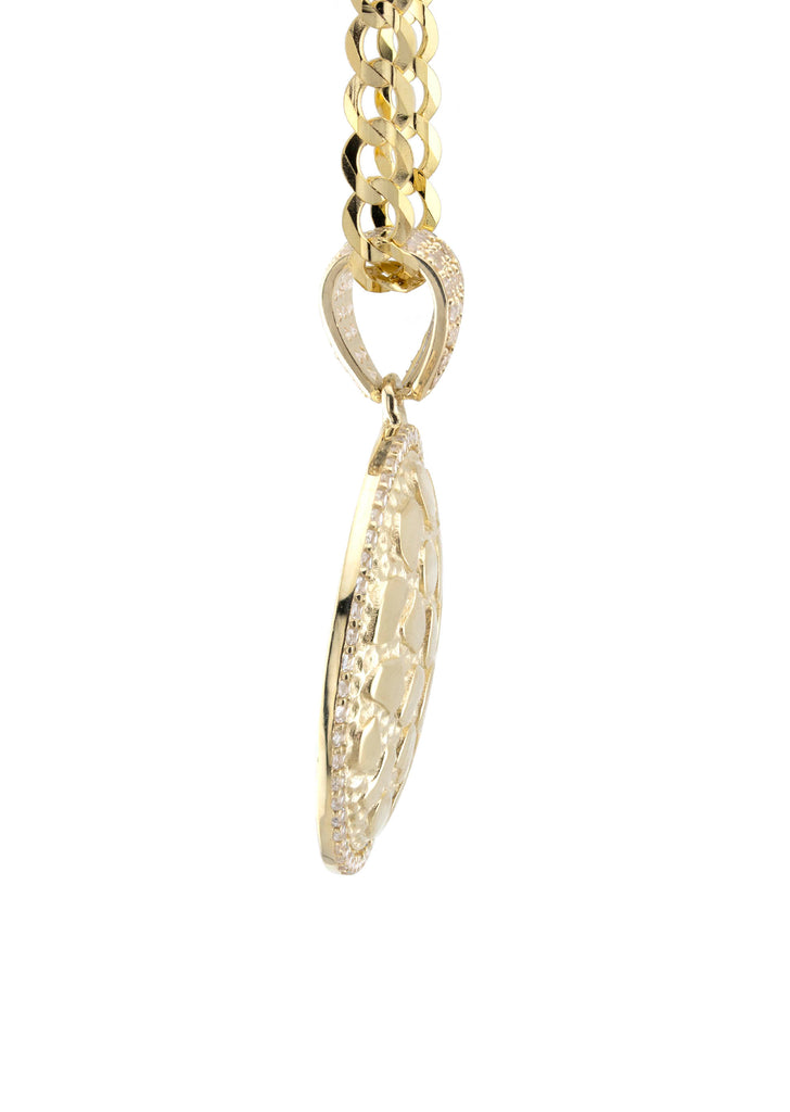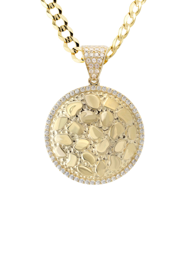 10K Yellow Gold Round Nugget Necklace Encrusted With Cubic Zirconia Crystals With An Approximate Total Gram Weight Of 18.5. Pendant Weighs 4.5 Grams And The Chain Weighs 14 Grams. The Pendant Measurement Is 1 inches In Width And A Length Of 1.4 inches. The Length And Type Of The Chain Can Be Adjusted Or Select The No Chain Option.