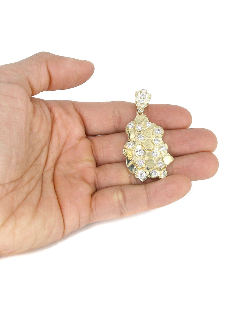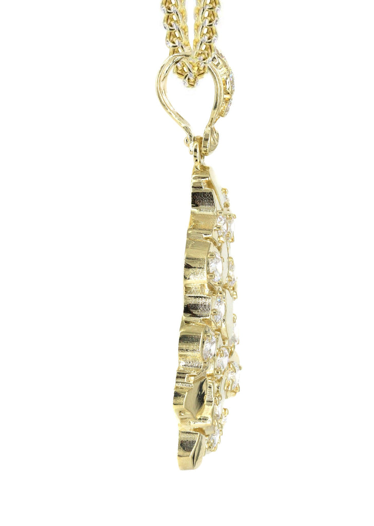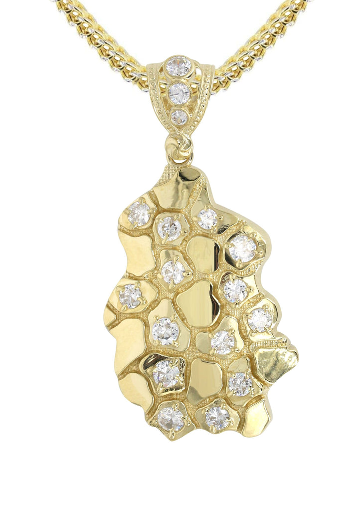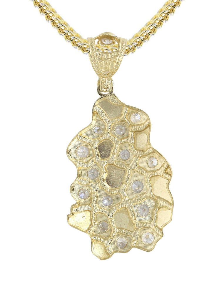 Franco Chain And Nugget Pendant With An Approximate Total Gram Weight Of 19.4. Pendant Weighs 9.4 Grams And The Chain Weighs 10 Grams. The Pendant Measurement Is 1 inches In Width And A Length Of 2.2 inches. The Width Of The Chain Is 3 Mm And The Length Of The Chain Can Be Adjusted.