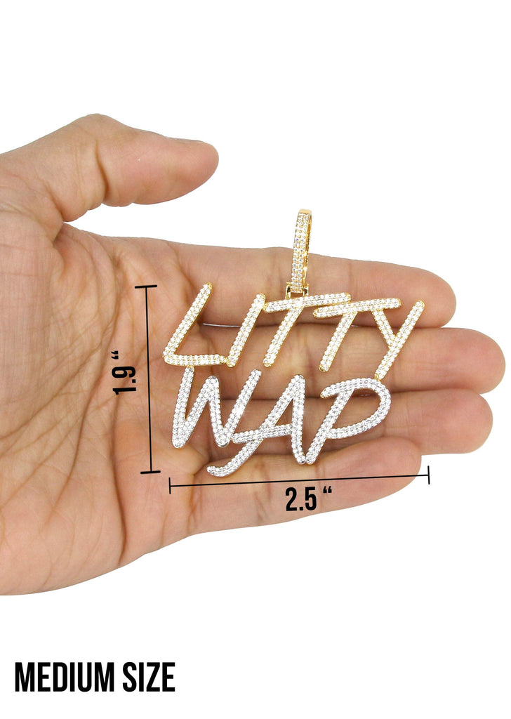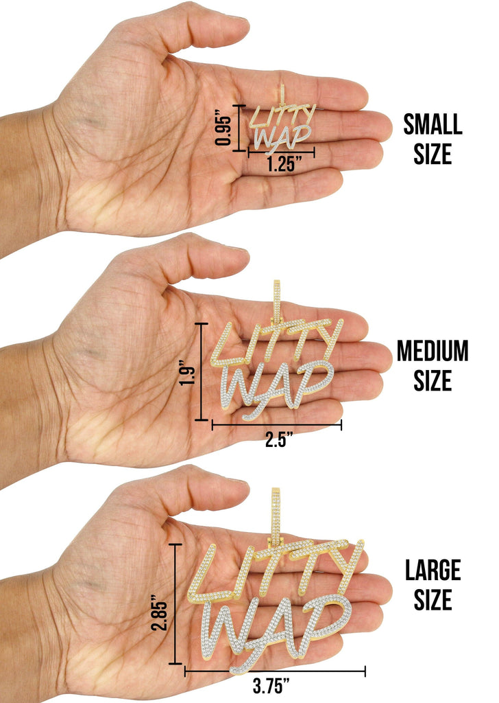 Customize your piece in 10K or 14K Yellow, Rose or White Gold - piece comes in VS quality diamonds. Select the size you want to make it in - Small, Medium or Large, see picture for approximate size chart.  After picking you dimensions - type what you want your piece to say and we will custom build it for you.  Please allow 3 weeks for completion.
