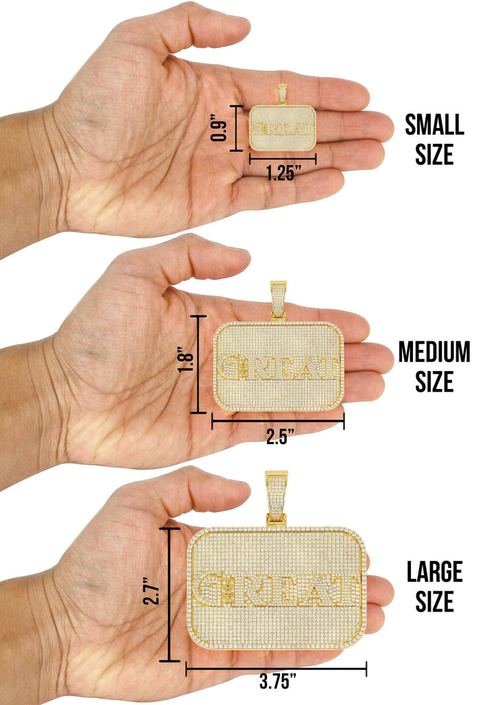 Customize your piece in 10K or 14K Yellow, Rose or White Gold - piece comes in VS quality diamonds. Select the size you want to make it in - Small, Medium or Large, see picture for approximate size chart.  After picking you dimensions - type what you want your piece to say and we will custom build it for you.  Please allow 3 weeks for completion.