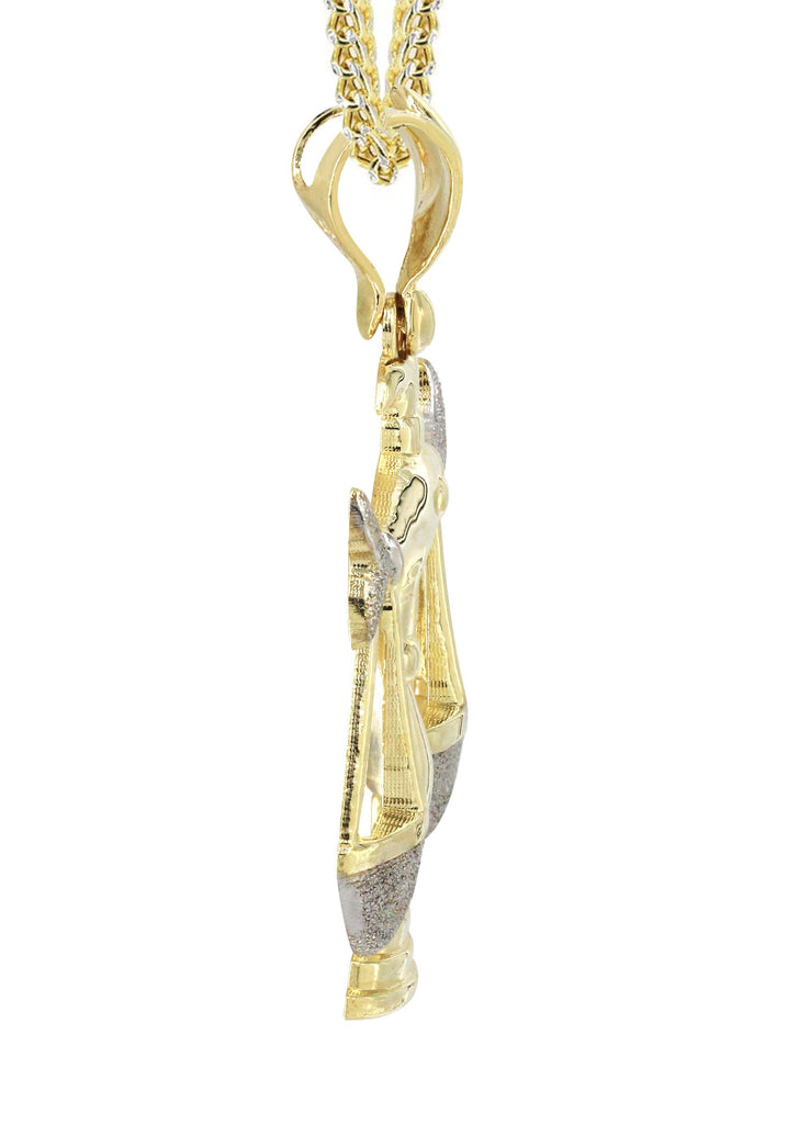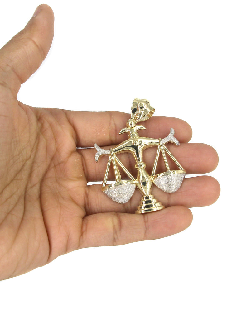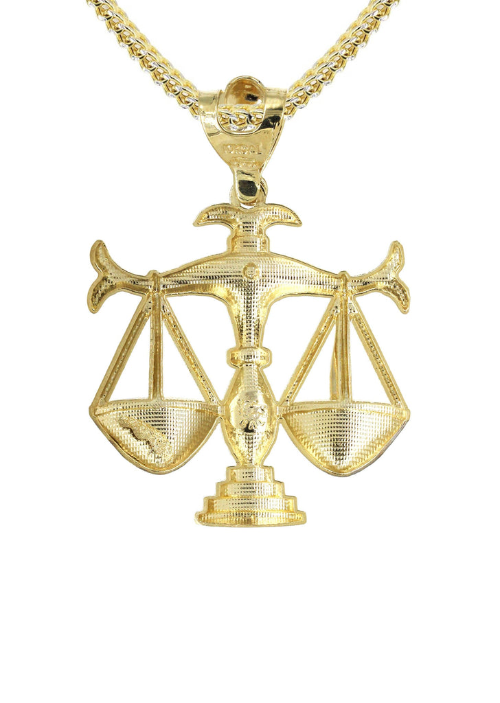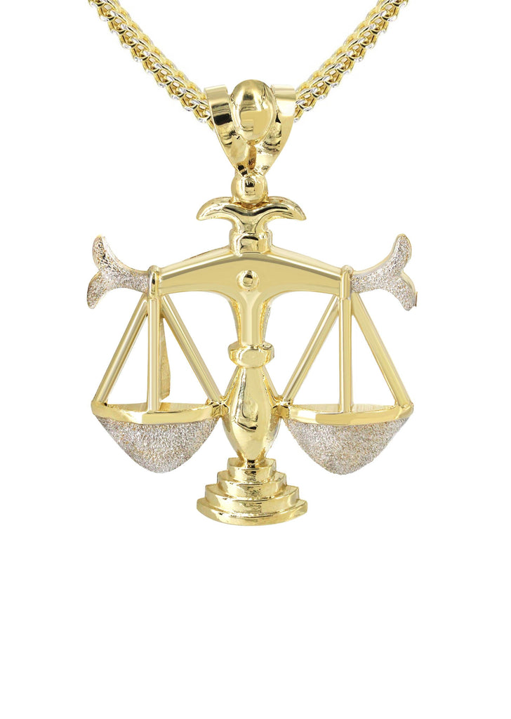 Franco Link Chain And Scales of Justice Pendant With An Approximate Total Gram Weight Of 23.3. Pendant Weighs 13.3 Grams And The Chain Weighs 10 Grams. The Pendant Measurement Is 1.8 Inches In Width And A Length Of 2.6 Inches. The Width Of The Chain Is 3 Mm And The Length Of The Chain Can Be Adjusted. ">-100% REAL GOLD