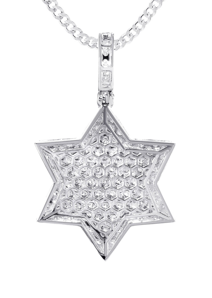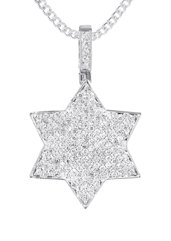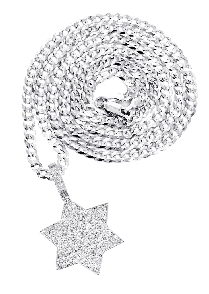| 14k white gold diamond star of david pendant & cuban chain which comes in 1.4 Inches in length and 0.9 Inches in width. The pendant weights appx 4 grams has 1.58 Carats of Vs quality diamonds. The chain options include a gold cuban chain, franco or rope with a width of 3mm's and the length can be selected to any preference. |