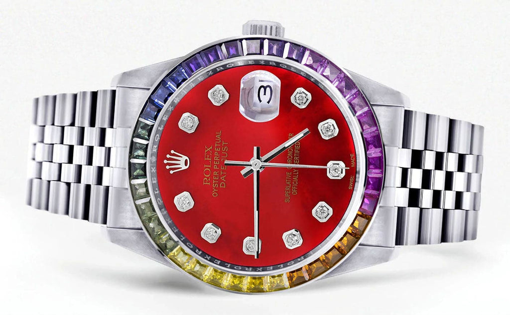 Diamond Gold Rolex Watch For Men 16200 | 36Mm | Rainbow Sapphire Bezel | Red Dial | Jubilee Band