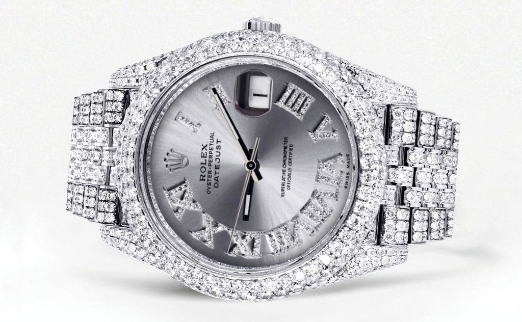 Diamond Iced Out Rolex Datejust 41 | 25 Carats Of Diamonds | Custom Silver Roman Numeral Diamond Dial | Two Row | Jubilee Band