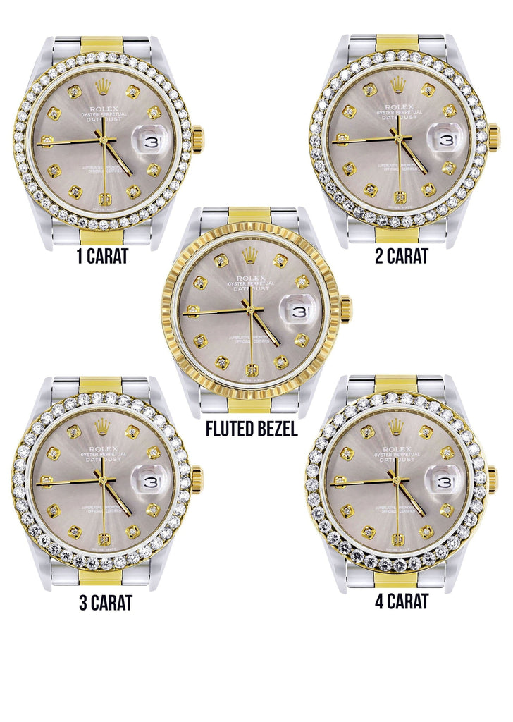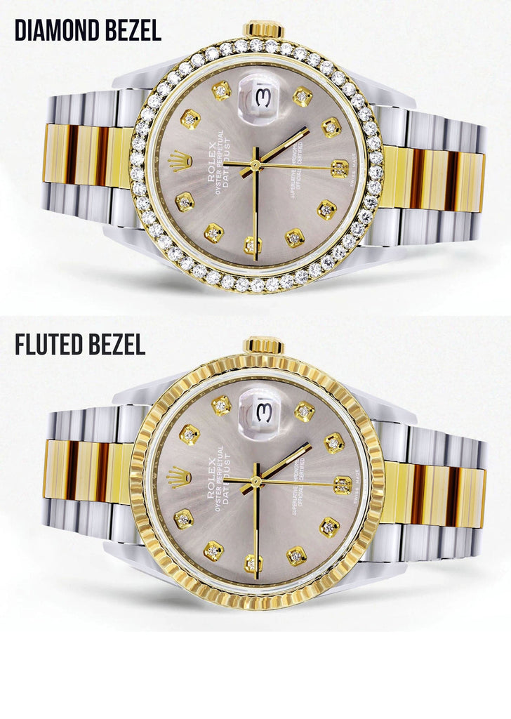 Rolex Datejust 36MM with a Oyster Band. You can customize the bezel type between Gold Fluted Bezel or Diamond Bezel ranging from 1.00-4.00 carat. Below are more details of the watch.