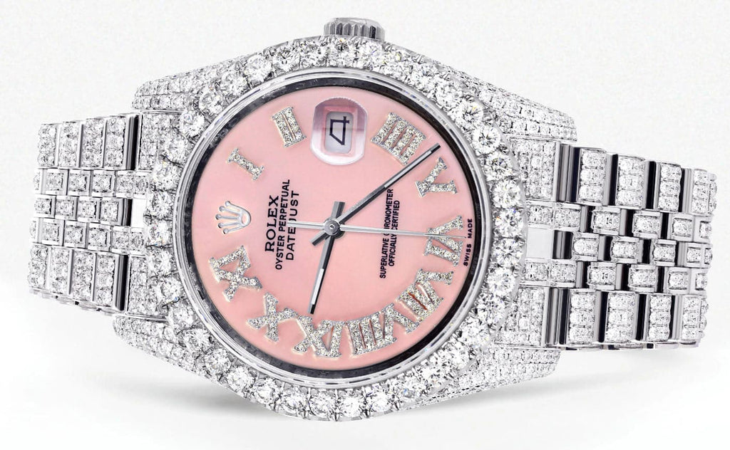 Iced Out Rolex Datejust 36 MM | Stainless Steel | 16.5 Carats of Diamonds | Pink Roman Diamond Dial | Jubilee Band | Model 116200