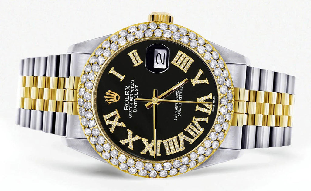 Diamond Gold Rolex Watch For Men 16233 | 36Mm | Black Roman Dial | Two Row 4.25 Carat Bezel | Jubilee Band