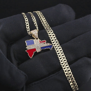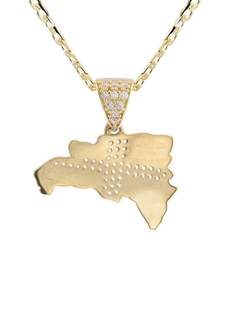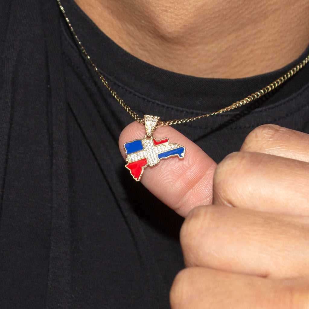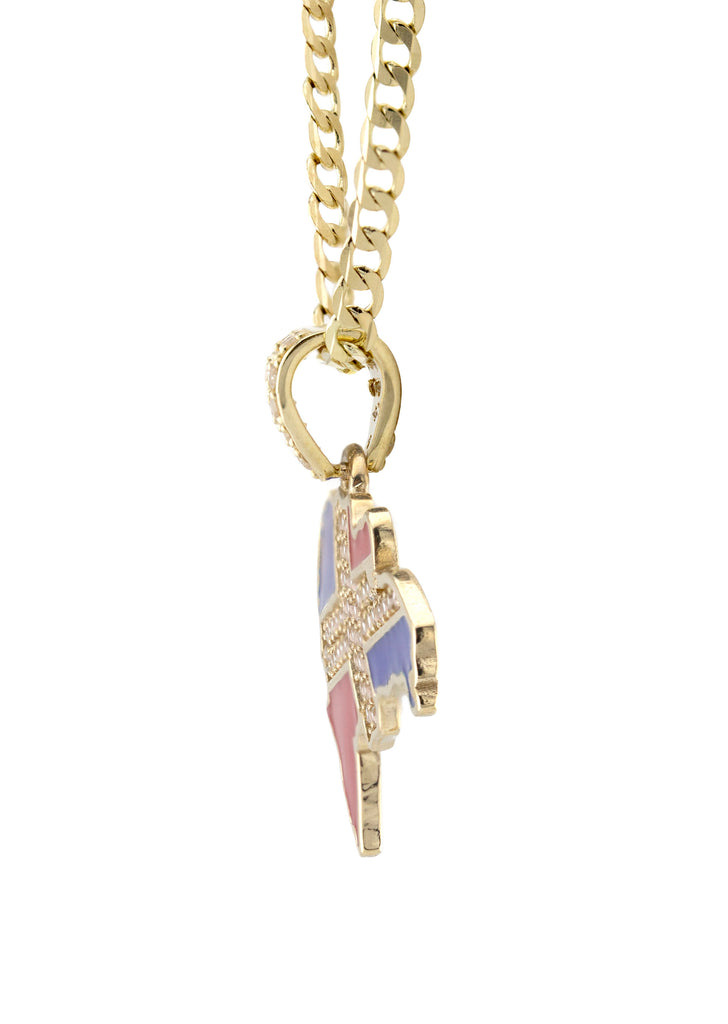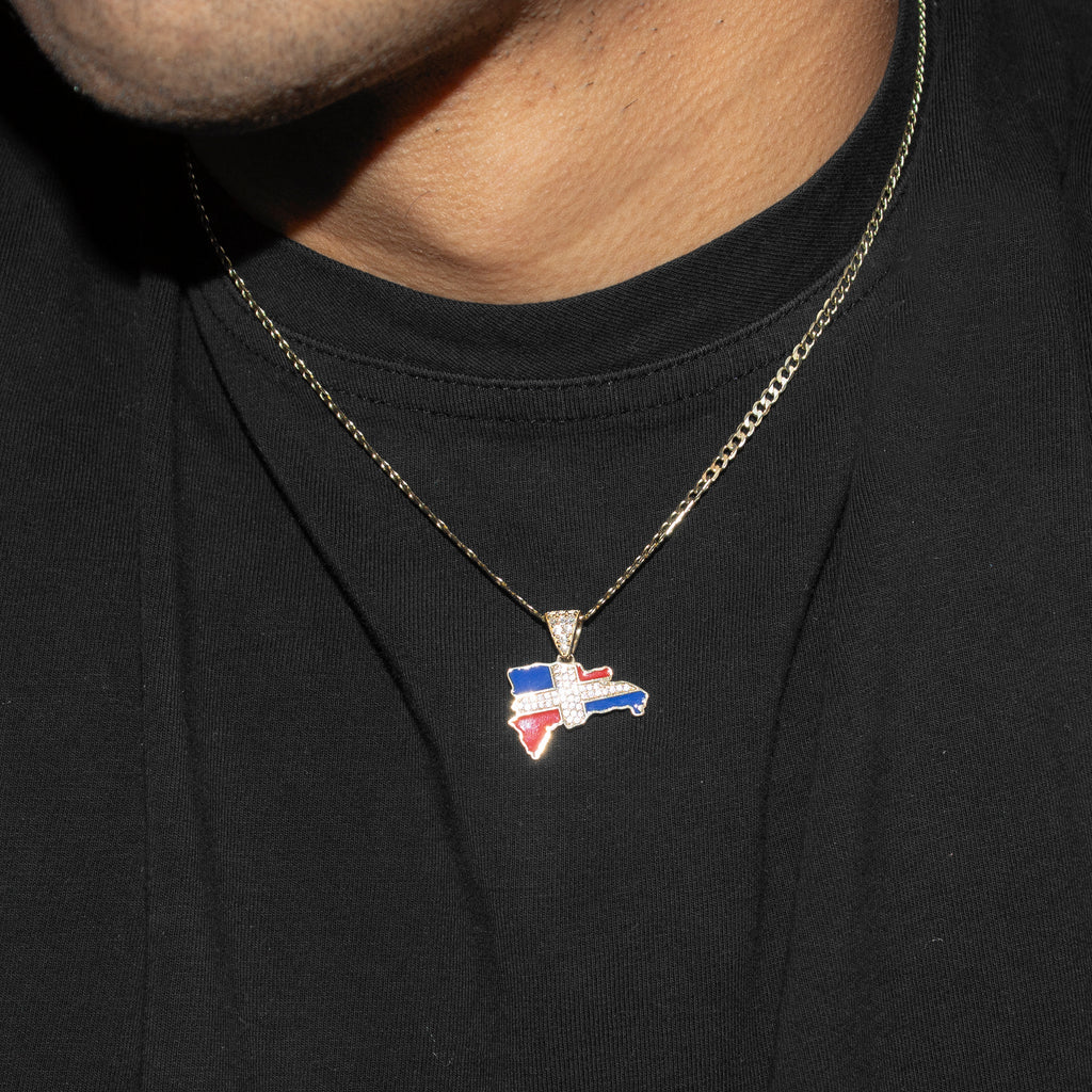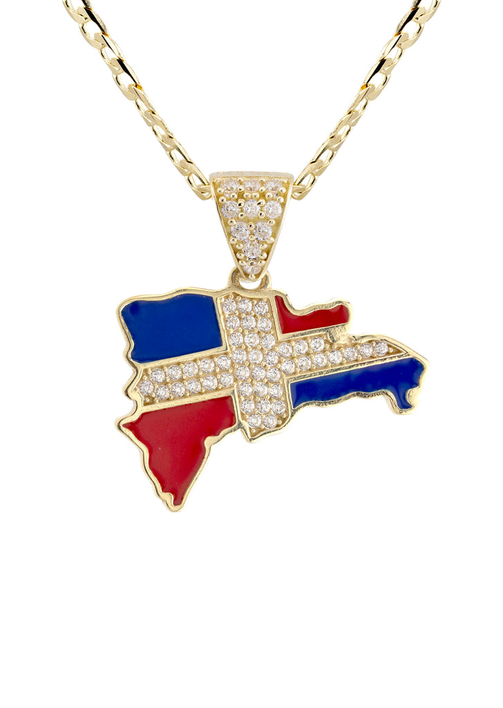 10K Yellow Gold Flag of the Dominican Republic Necklace Encrusted With Cubic Zirconia Crystals With An Approximate Total Gram Weight Of 5.8. Pendant Weighs 1.8 Grams And The Chain Weighs 4 Grams. The Pendant Measurement Is 0.8 inches In Width And A Length Of 0.8 inches. The Length And Type Of The Chain Can Be Adjusted Or Select The No Chain Option.