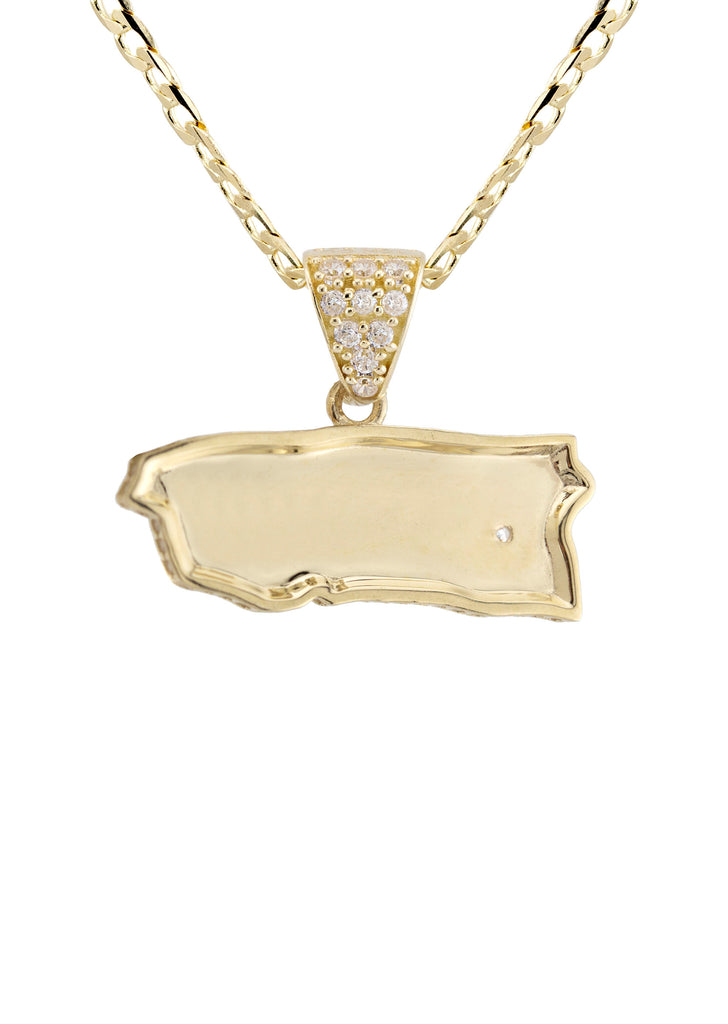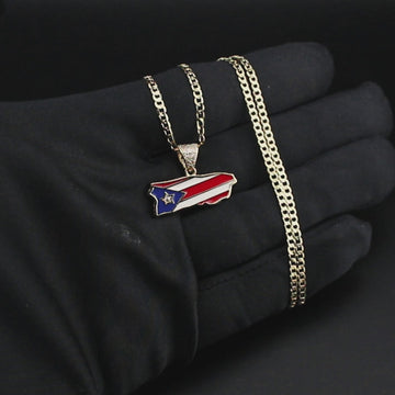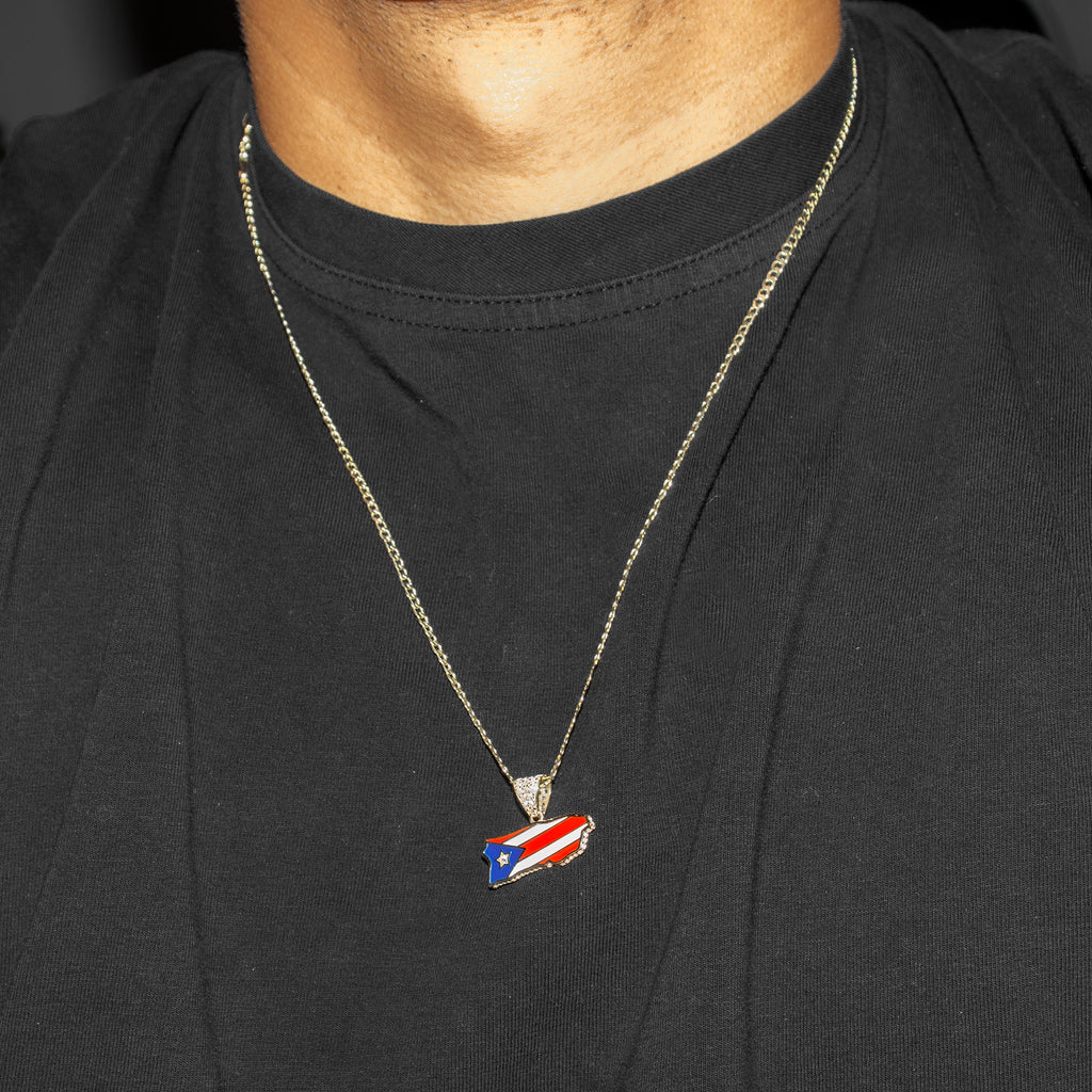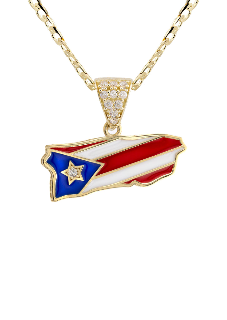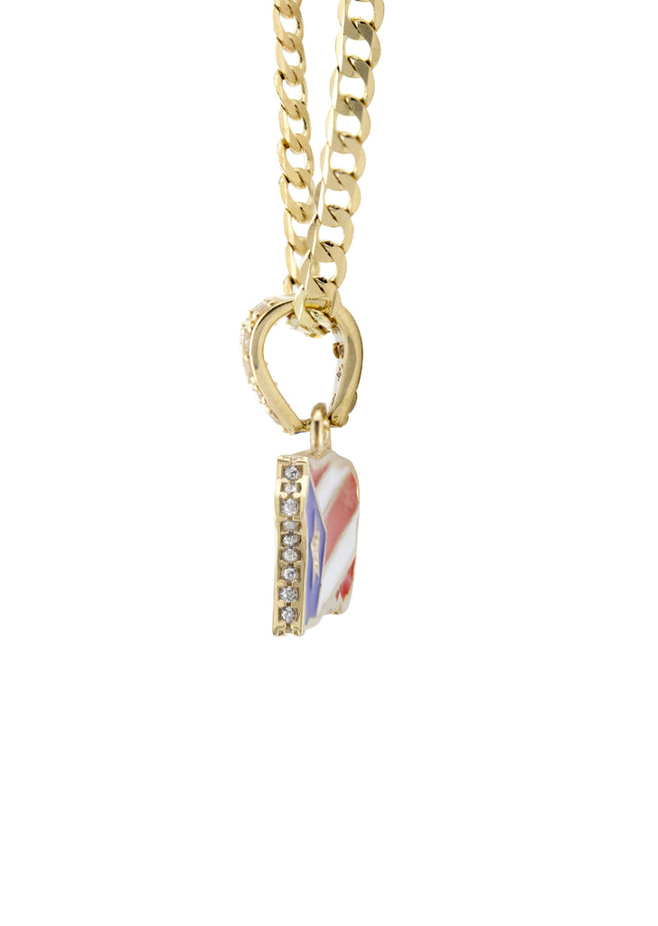 10K Yellow Gold Puerto Rico Flag Necklace Encrusted With Cubic Zirconia Crystals With An Approximate Total Gram Weight Of 6.3. Pendant Weighs 2.3 Grams And The Chain Weighs 4 Grams. The Pendant Measurement Is 1 inches In Width And A Length Of 0.7 inches. The Length And Type Of The Chain Can Be Adjusted Or Select The No Chain Option.