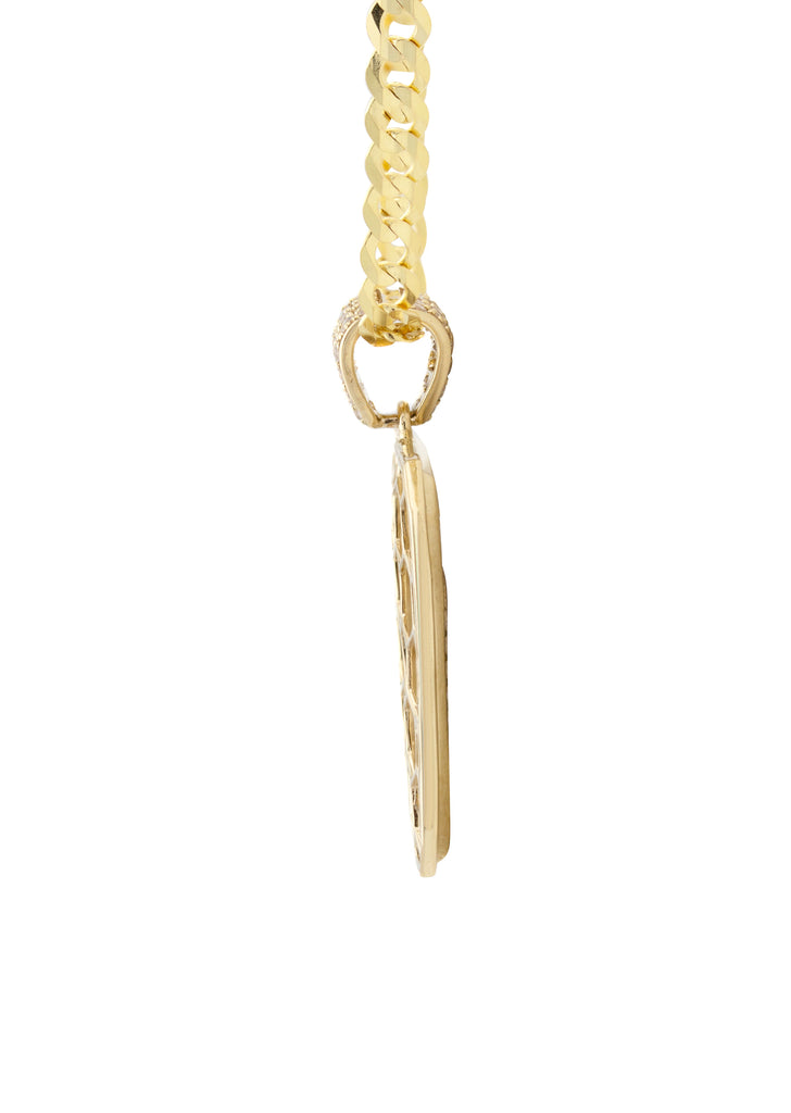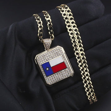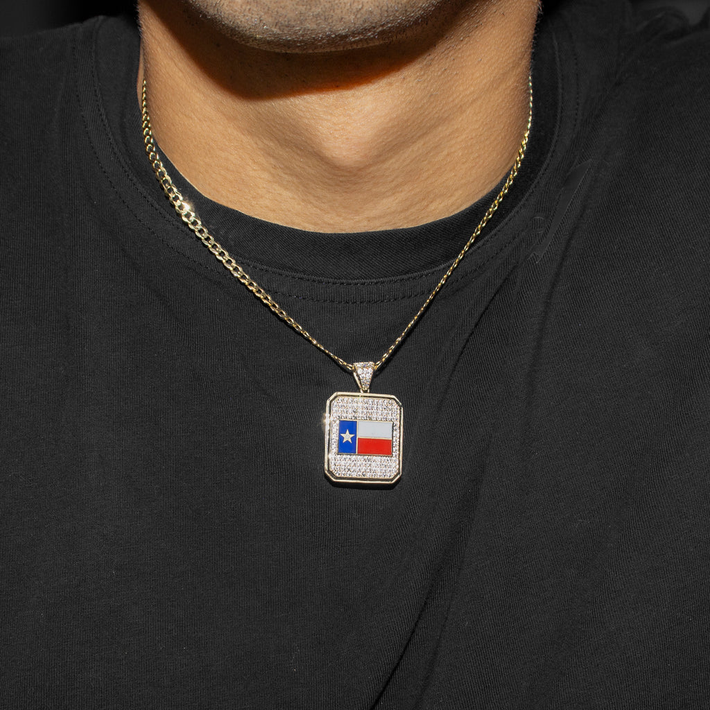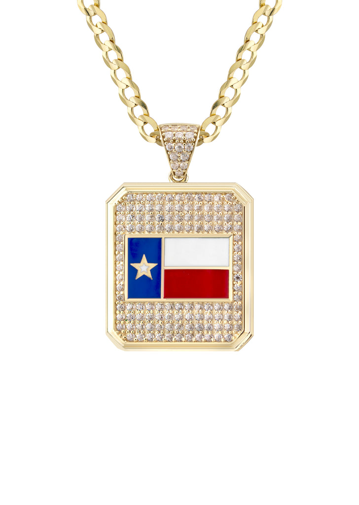 10K Yellow Gold Flag of Texas Necklace Encrusted With Cubic Zirconia Crystals With An Approximate Total Gram Weight Of 12. Pendant Weighs 5 Grams And The Chain Weighs 7 Grams. The Pendant Measurement Is 0.9 inches In Width And A Length Of 1.3 inches. The Length And Type Of The Chain Can Be Adjusted Or Select The No Chain Option.