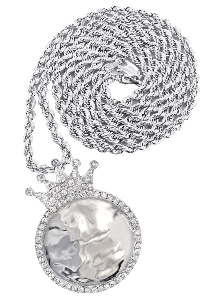 14K White Gold Diamond Crown Dog Tag Picture Pendant Necklace | 1.4 Carats | Appx. 17.2 Grams