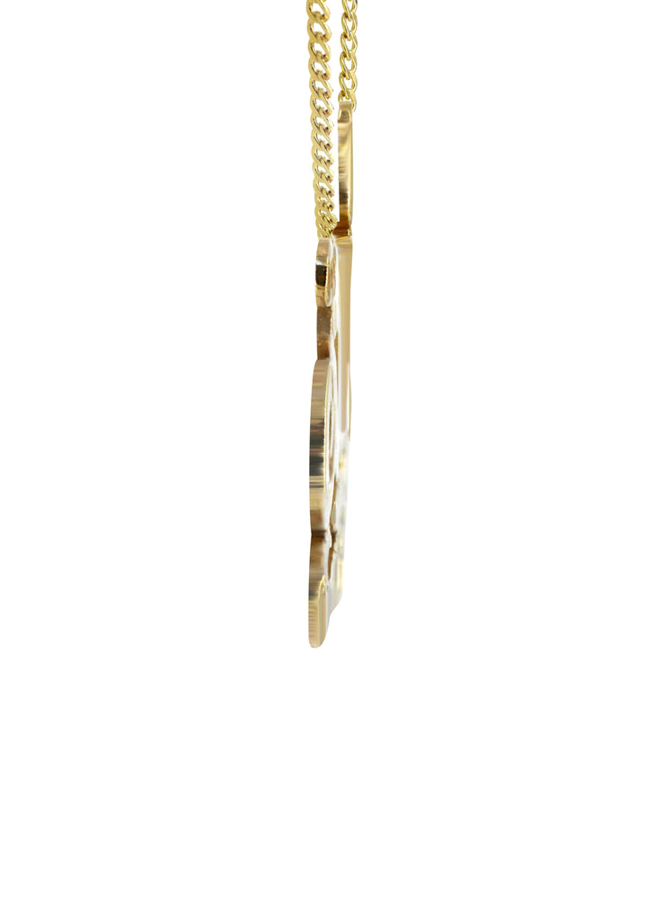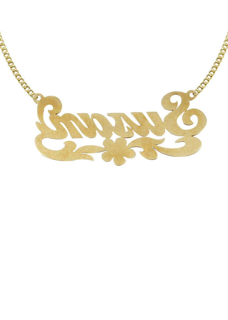 14K Ladies Diamond Cut Name Plate Necklace. The length of the pendant is 0.7 inches and the width is 1.7 inches. The name plate comes with a cuban chain which can be selected to any length above. Due to the custom nature of this product, please allow 10-14 business days for completion.