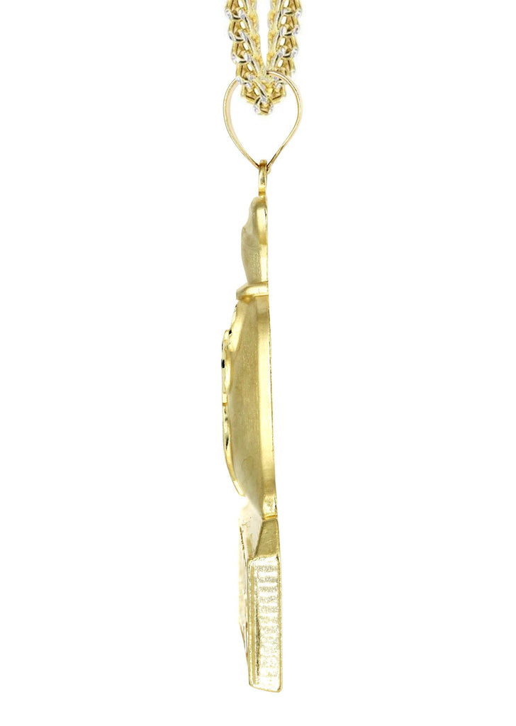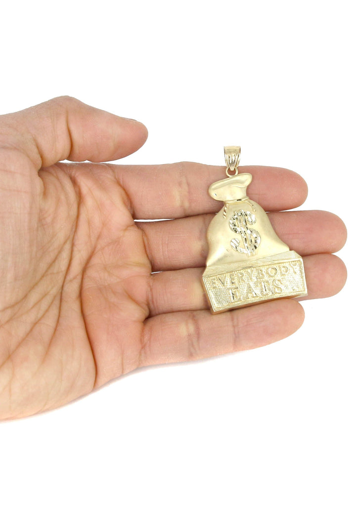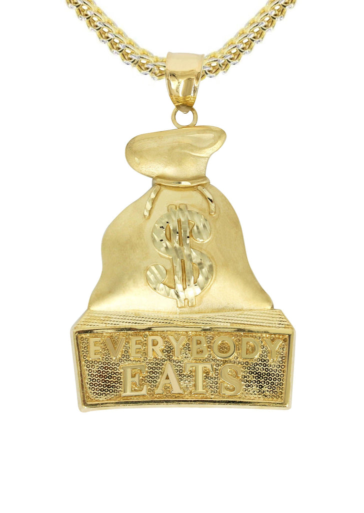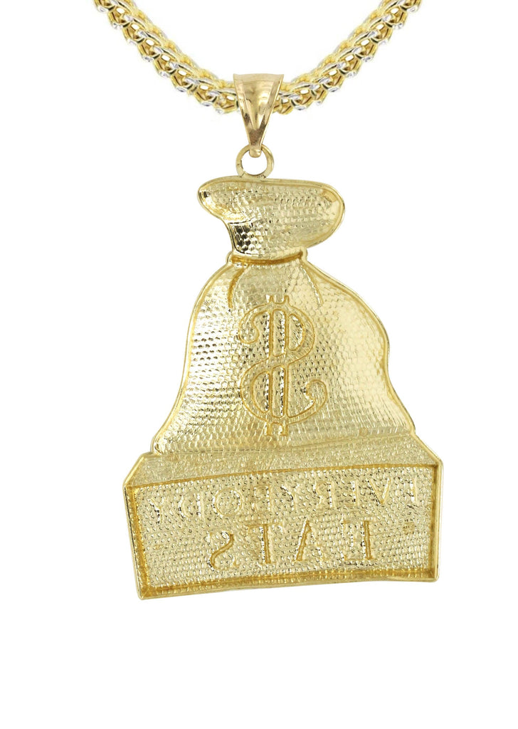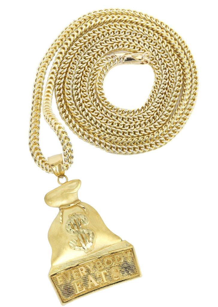 Franco Chain And Money Bag Pendant With An Approximate Total Gram Weight Of 21.6. Pendant Weighs 11.6 Grams And The Chain Weighs 10 Grams. The Pendant Measurement Is 1.4 inches In Width And A Length Of 2.4 inches. The Width Of The Chain Is 3 Mm And The Length Of The Chain Can Be Adjusted.