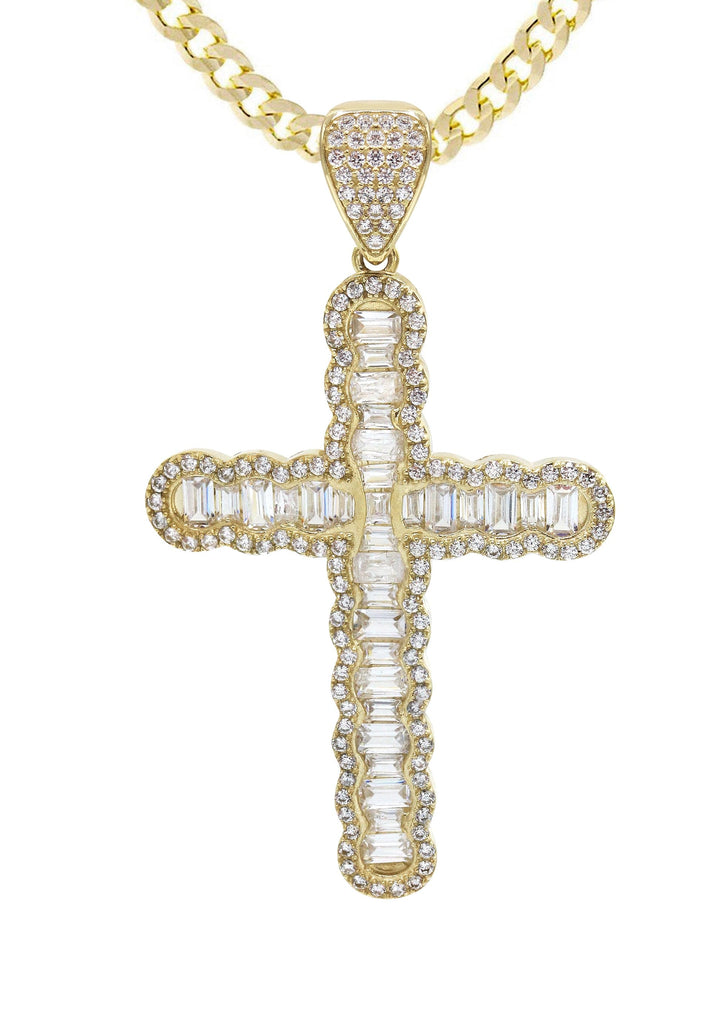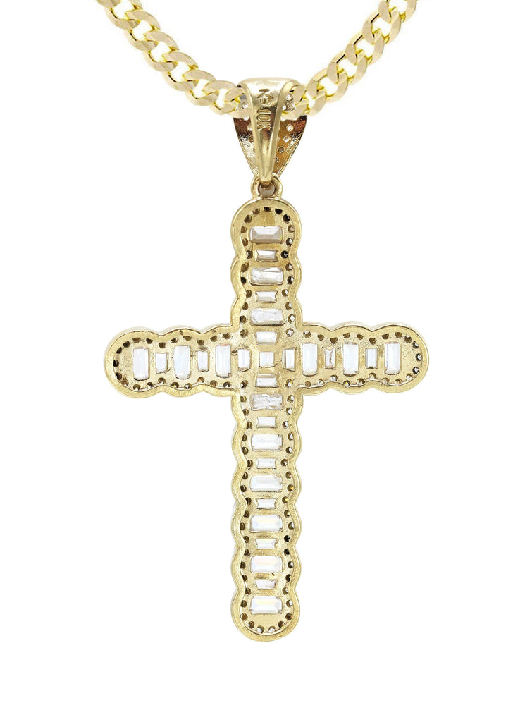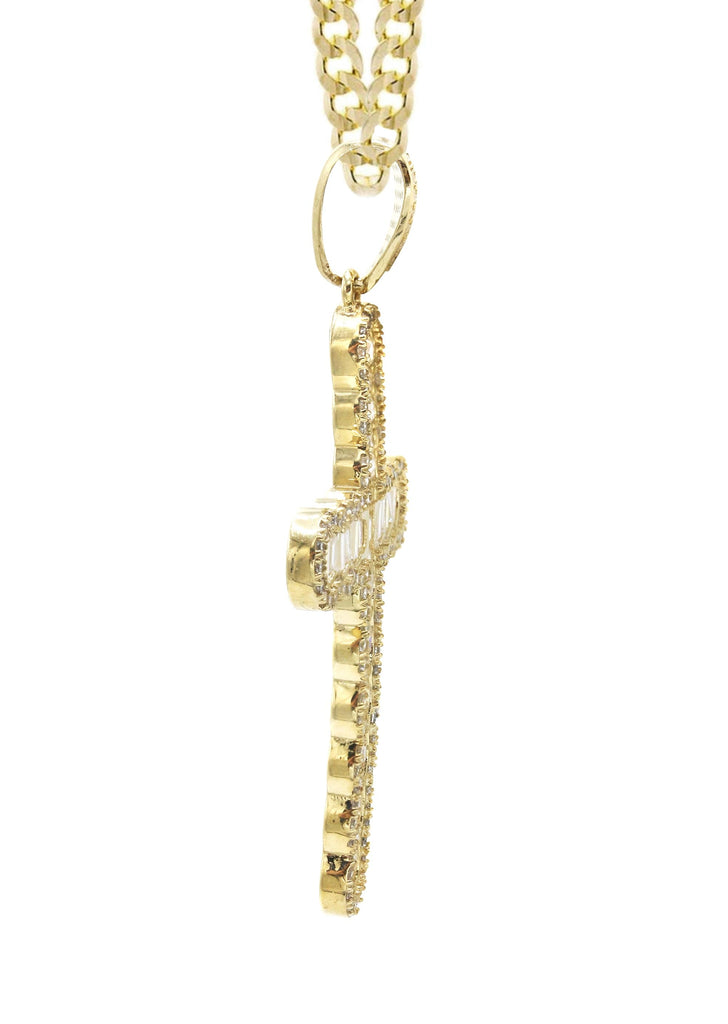 10K Gold Chain And Cz Baguette Cross Pendant With An Approximate Total Gram Weight Of 15.6. Pendant Weighs 5.6 Grams And The Chain Weighs 10 Grams. The Pendant Measurement Is 1.2 inches In Width And A Length Of 2 inches. The Width Of The Chain Is 3 Mm The Length And Type Of The Chain Can Be Adjusted.