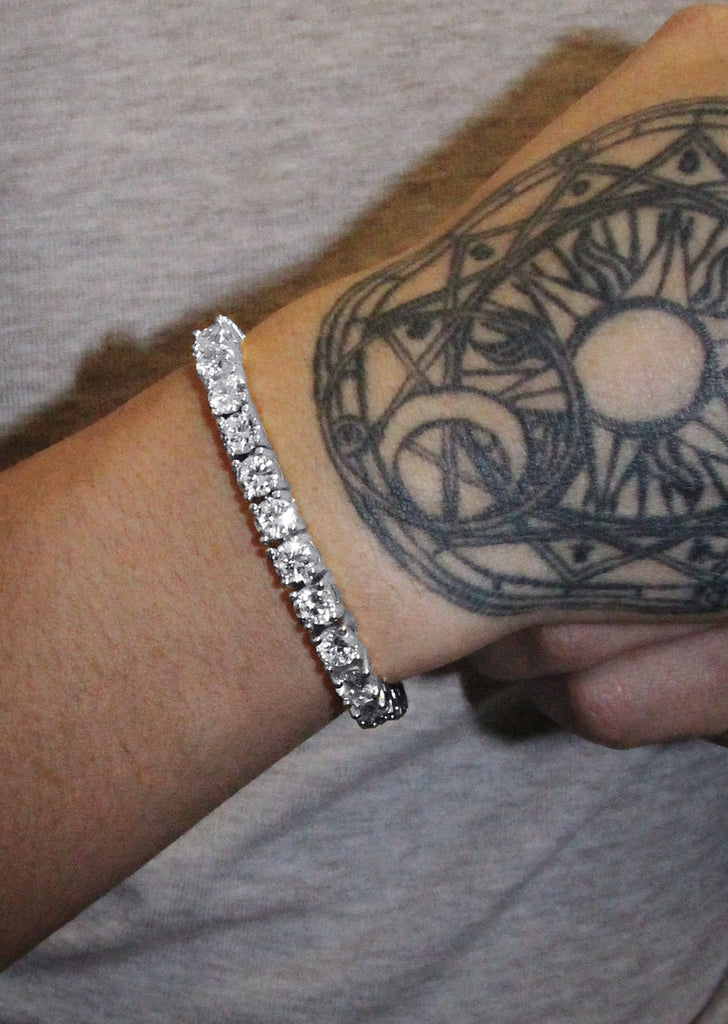 White Gold Plated Mens Tennis Bracelet. The Bracelet can be customized to any width and length by selecting the options above. Once you select your length and width, the price and the weight will adjust.