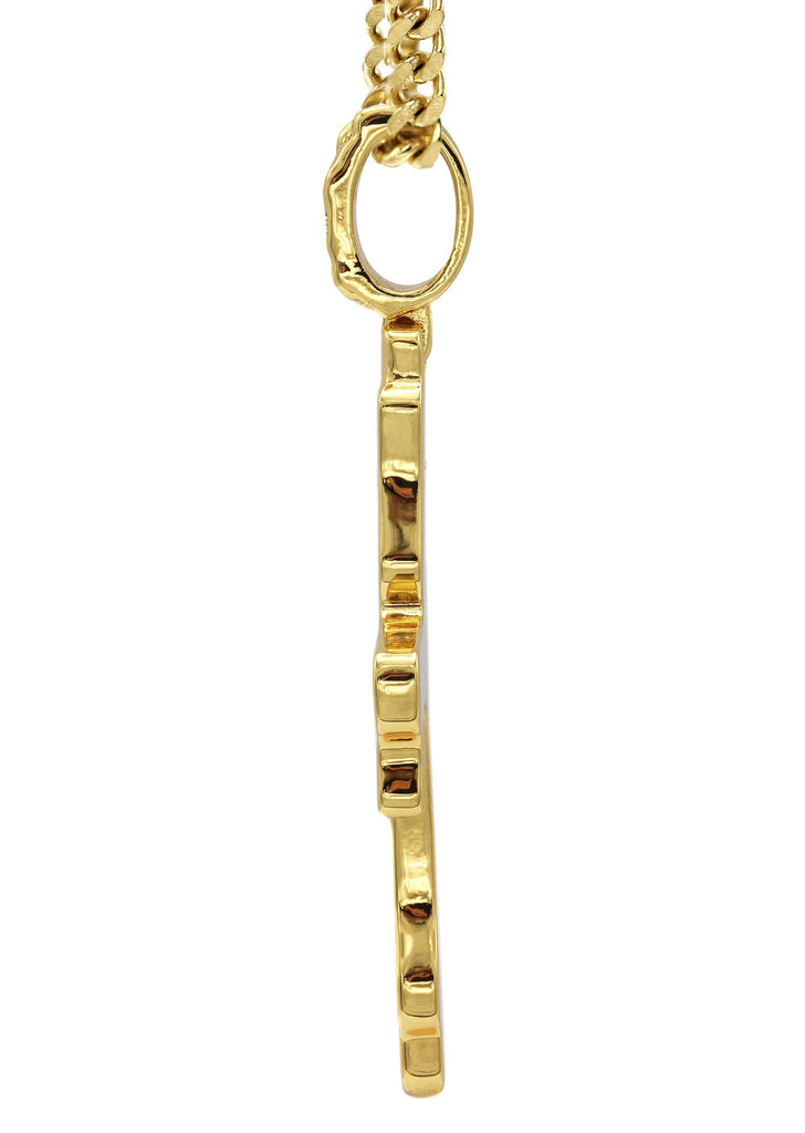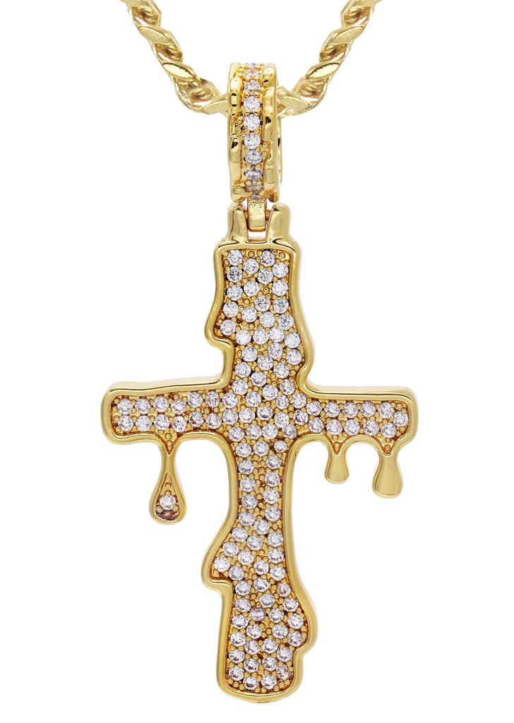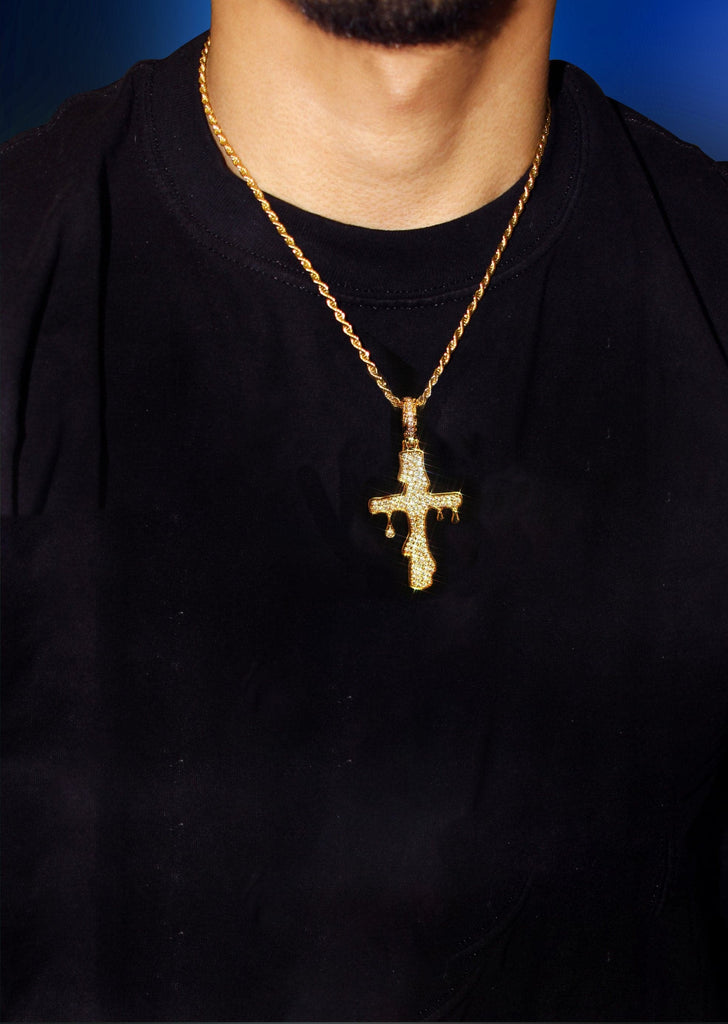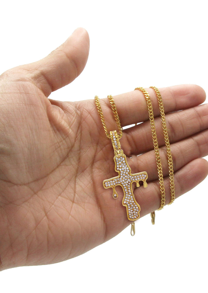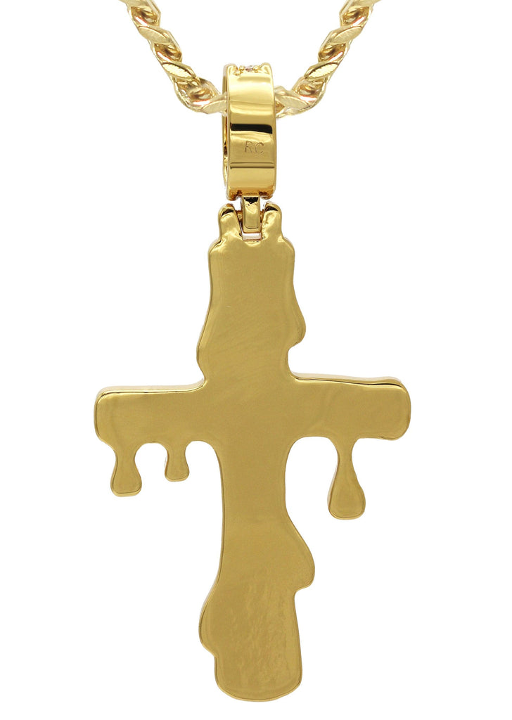 Yellow Gold Plated Cuban Link Chain & Melting Cross Pendant Which weighs 10.9 Grams. The Width Of The Pendant Is 1.16 Inches And The Length Of The Pendant Is 2.37 Inches. The Width Of The Chain Is 3mm And The Length Can Be Adjusted Above.