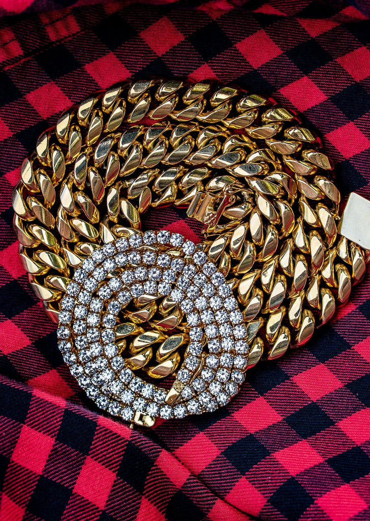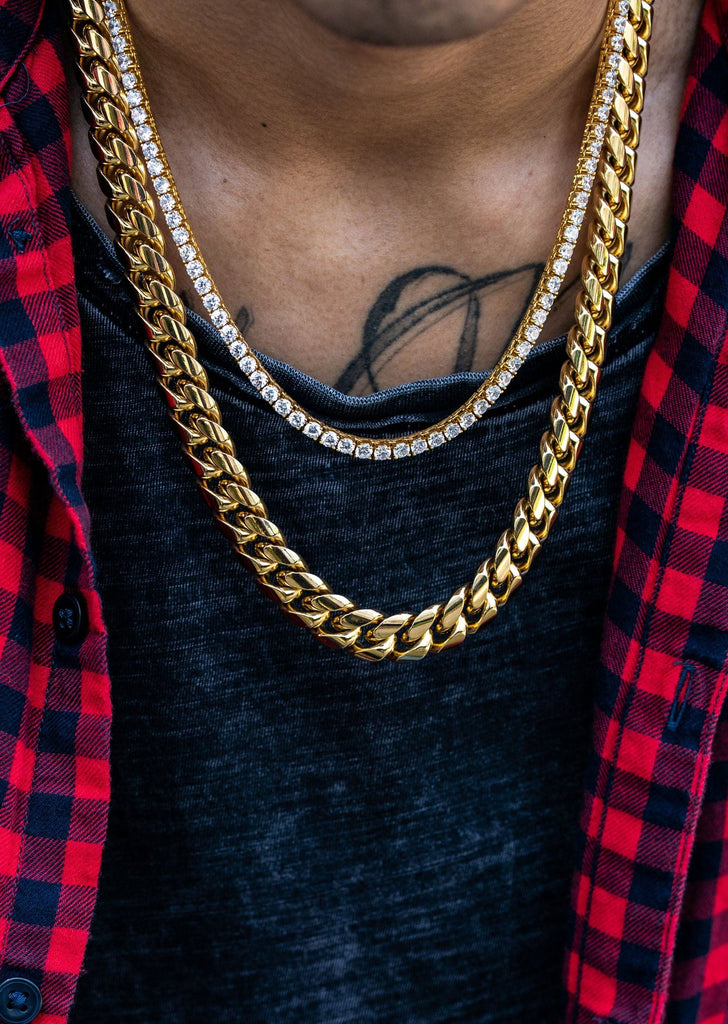 | Gold Plated Solid Miami Cuban Link Chain Which Comes In 14Mm Wide And 24 Inches Long Along With A Gold Plated CZ Tennis Chain 4Mm And 20 Inch In Length. You Can Also Customize The Chains To Any Length Preference You Like Up Top. |
