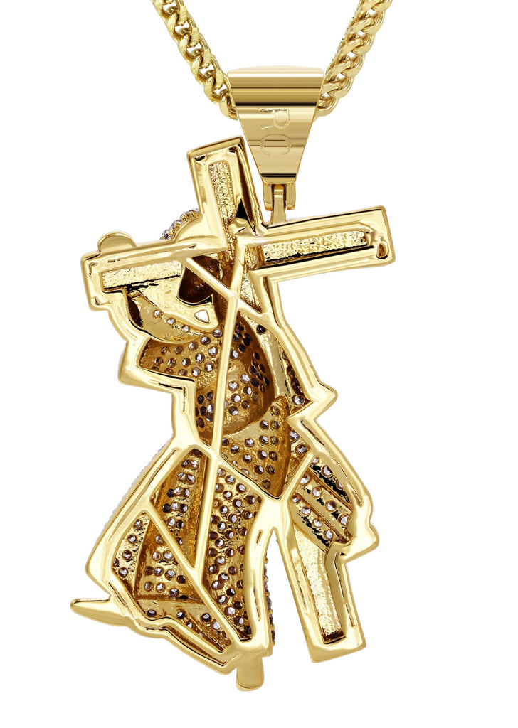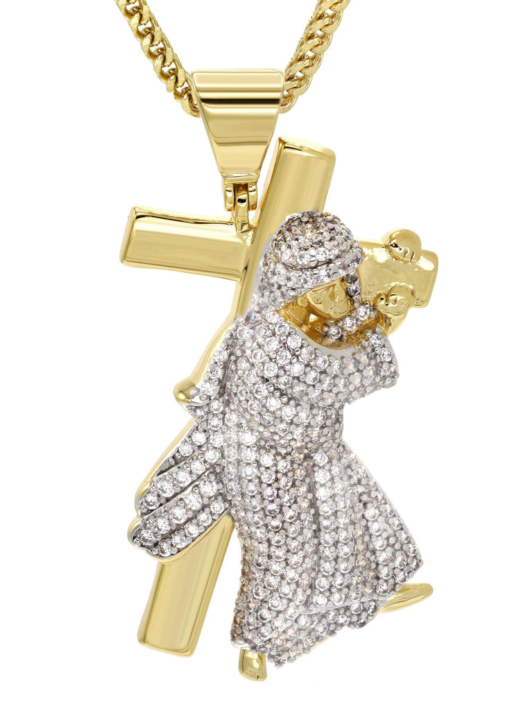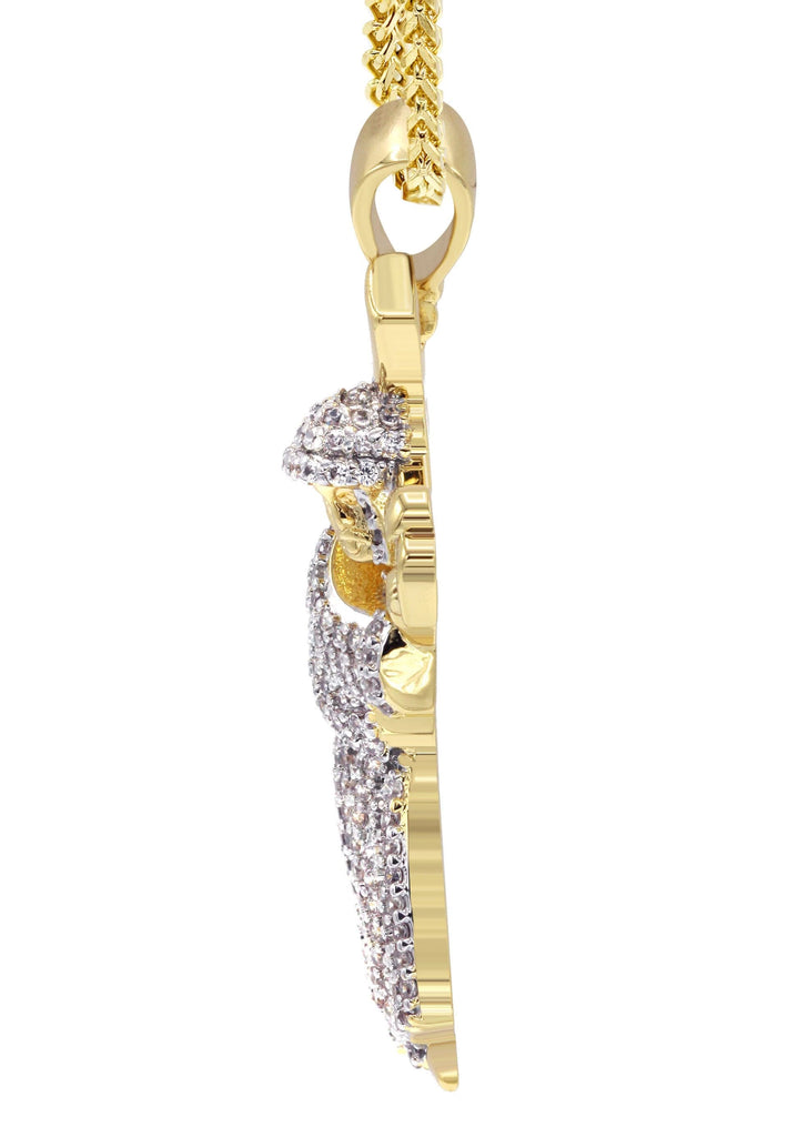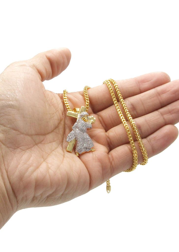 Gold Plated Franco Chain & Cross Pendant Which weighs 14.4 Grams. The Width Of The Pendant Is 1 Inches And The Length Of The Pendant Is 1.7 Inches. The Width Of The Chain Is 3mm And The Length Can Be Adjusted Above.