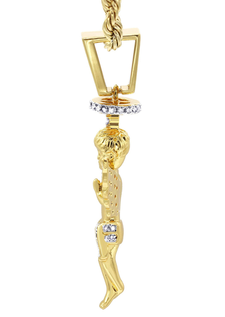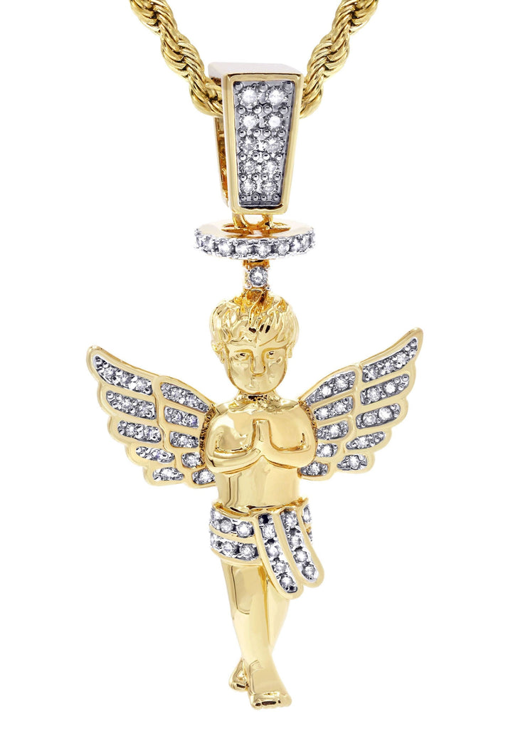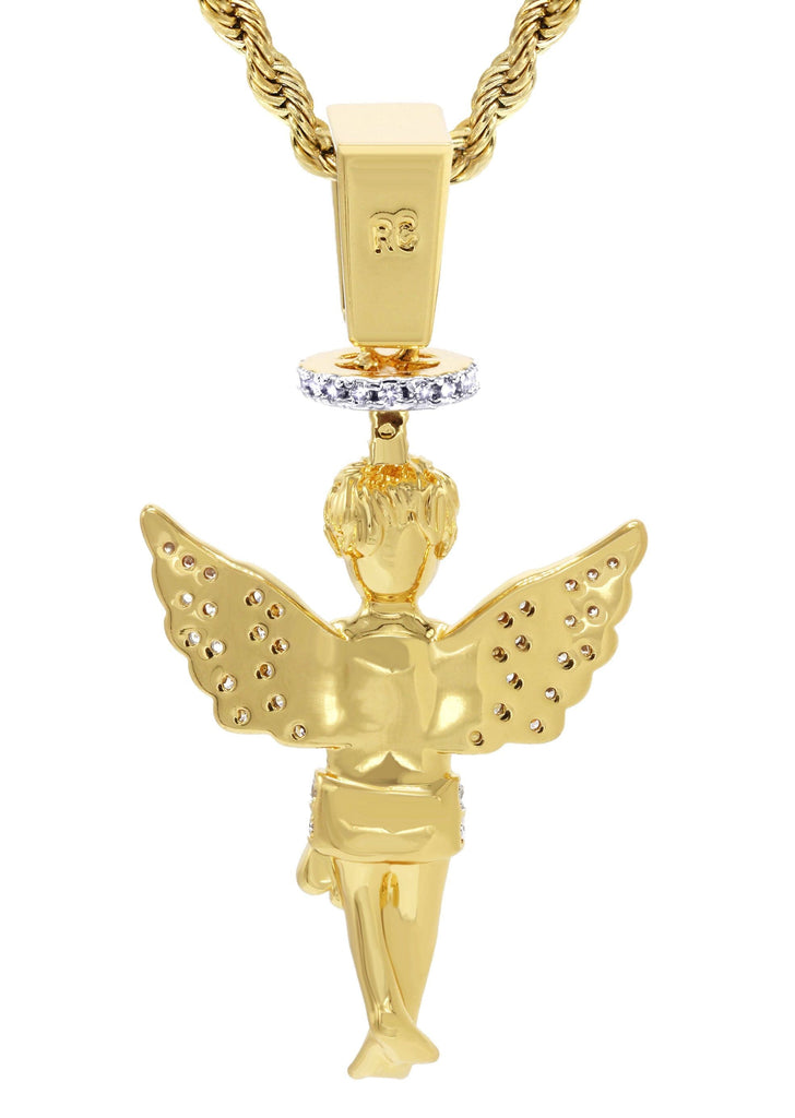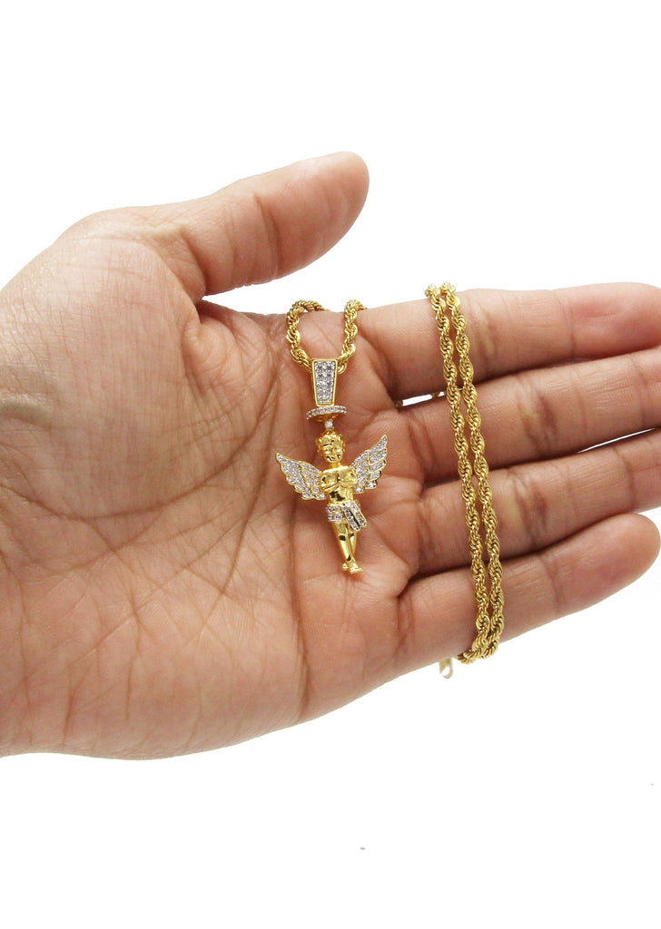 Gold Plated Rope Chain & Angel Pendant Which weighs 14.2 Grams. The Width Of The Pendant Is 0.9 Inches And The Length Of The Pendant Is 1.75 Inches. The Width Of The Chain Is 3mm And The Length Can Be Adjusted Above.div>