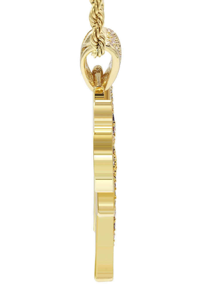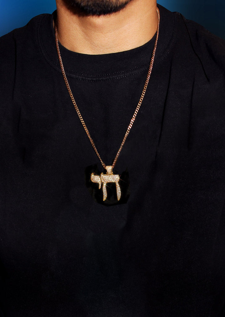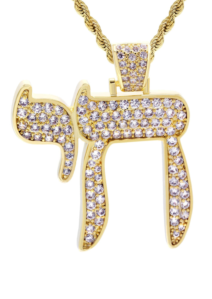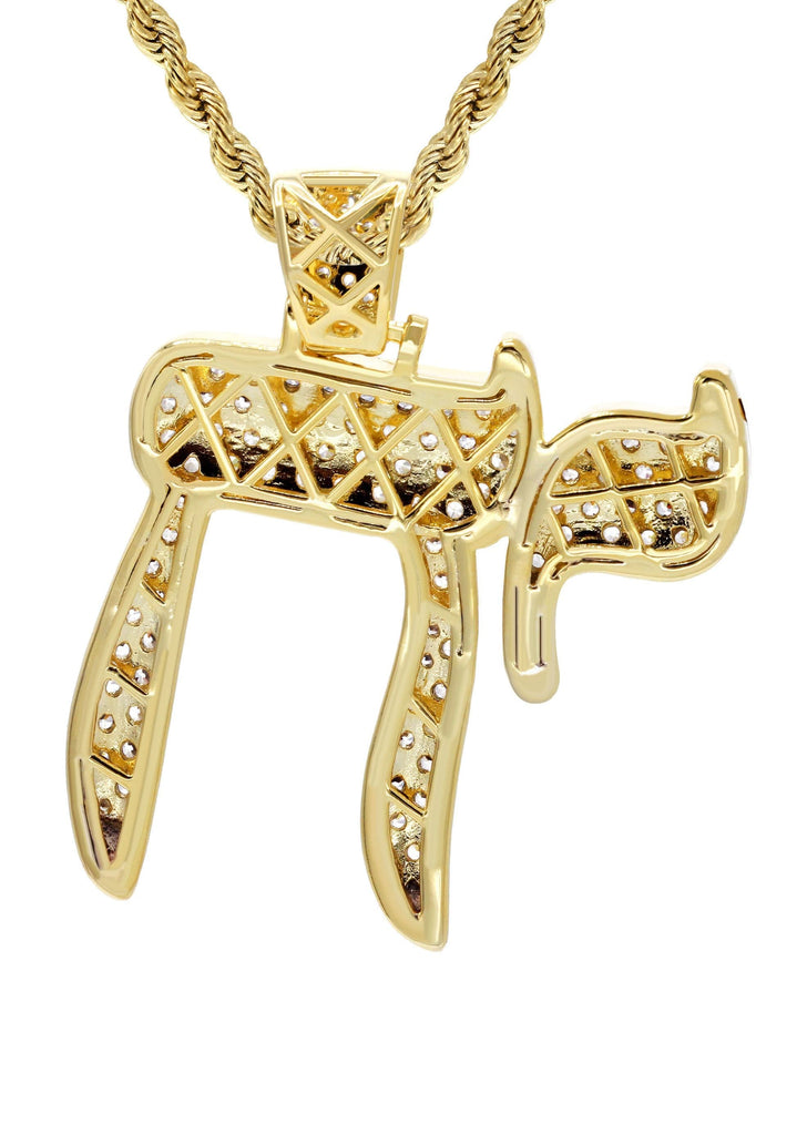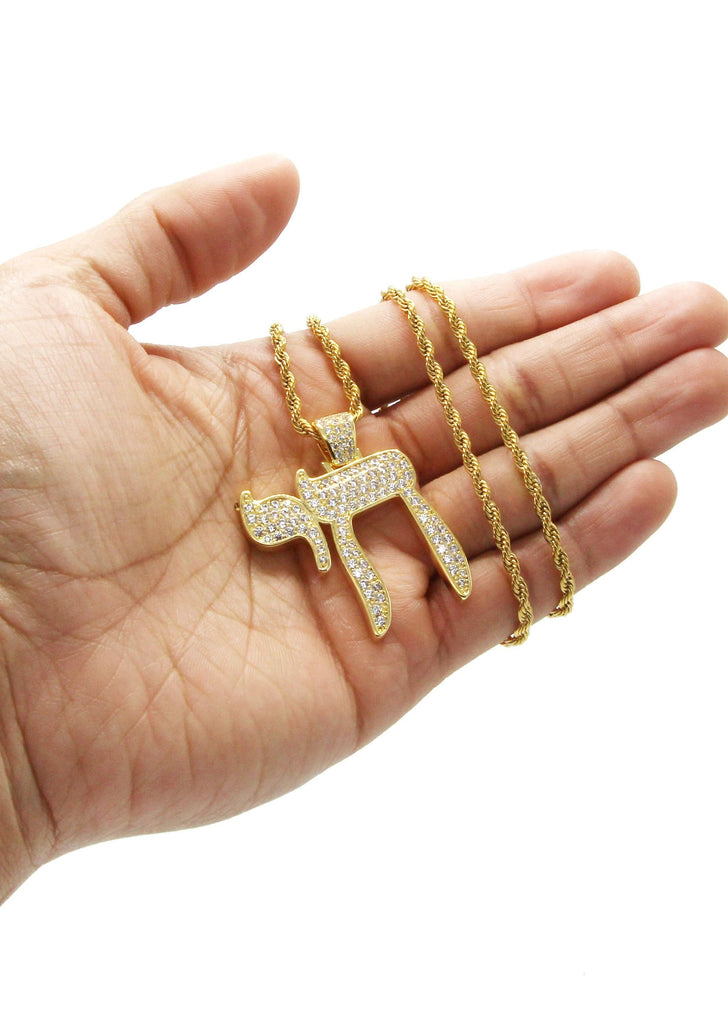 Gold Plated Rope Chain & Chai Pendant Which weighs 19.4 Grams. The Width Of The Pendant Is 1.4 Inches And The Length Of The Pendant Is 1.75 Inches. The Width Of The Chain Is 3mm And The Length Can Be Adjusted Above.