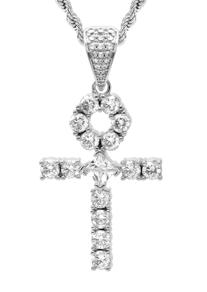 White Gold Plated Rope Chain & Ankh Pendant Which weighs 10 Grams. The Width Of The Pendant Is 1 And The Length Of The Pendant Is 2 Inches. The Width Of The Chain Is 3mm And The Length Can Be Adjusted Above.
