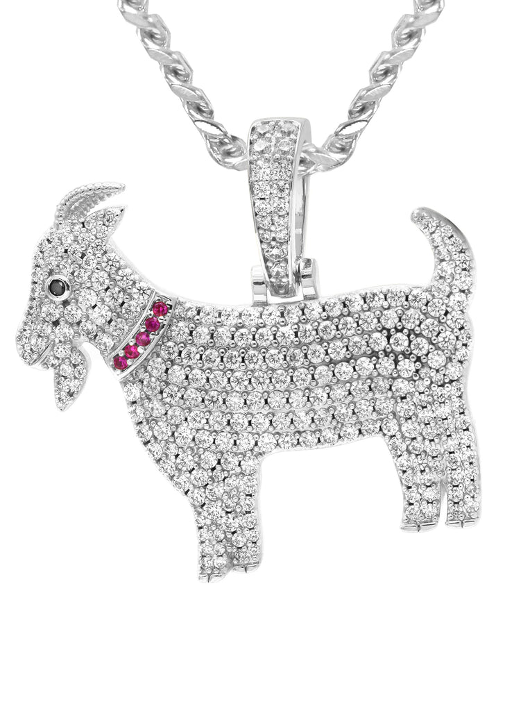White Gold Plated Cuban Link Chain & Goat Pendant Which weighs 14.5 Grams. The Width Of The Pendant Is 1.5 Inches And The Length Of The Pendant Is 1.42 Inches. The Width Of The Chain Is 3mm And The Length Can Be Adjusted Above.
