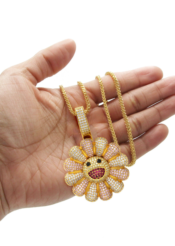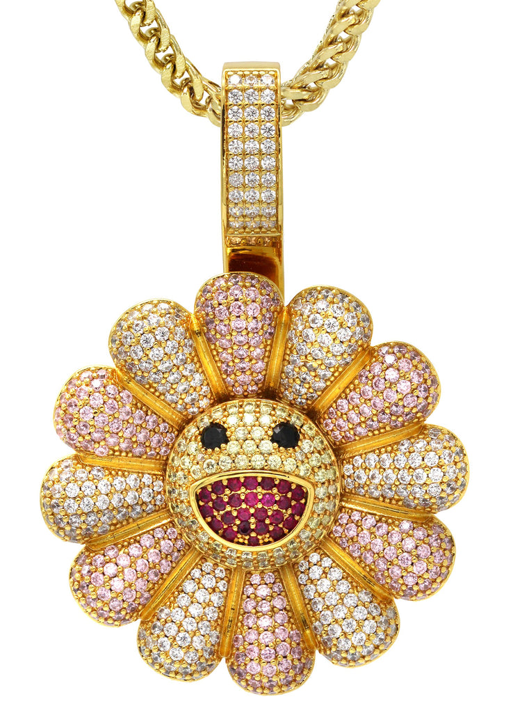 Yellow Gold Plated Franco Link Chain & Murakami Spinner Pendant Which weighs 30.8 Grams. The Width Of The Pendant Is 1.5 Inches And The Length Of The Pendant Is 2.25 Inches. The Width Of The Chain Is 3mm And The Length Can Be Adjusted Above.