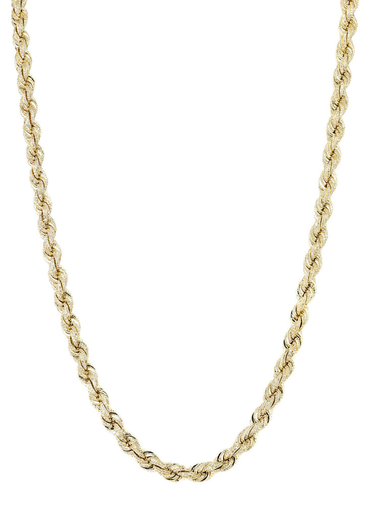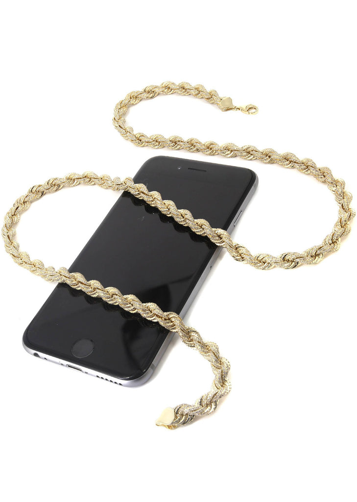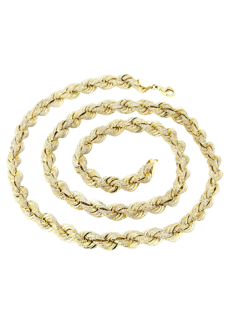 10K Yellow Gold Iced Out Rope Chain With Approximately 26.7 Carats Of Diamonds. This Hand Mad Rope Chain Weights 26 Grams And Comes In 28 Inces, 12 Mm In Width.