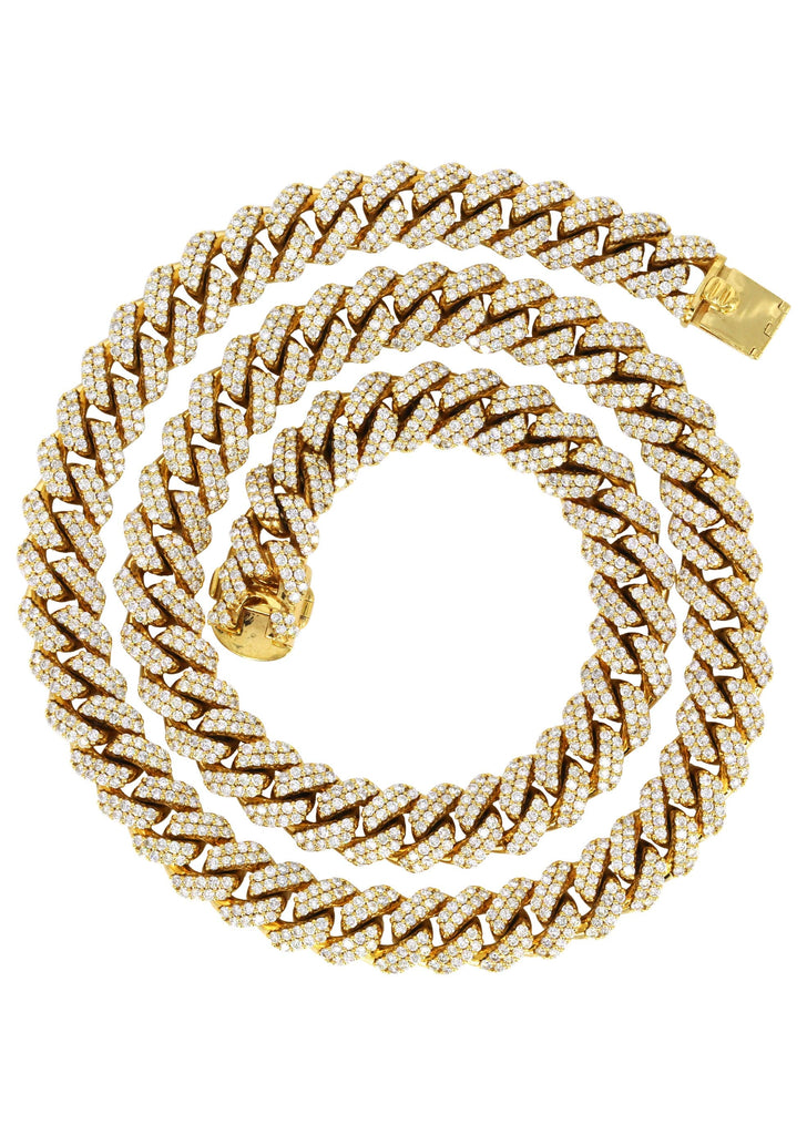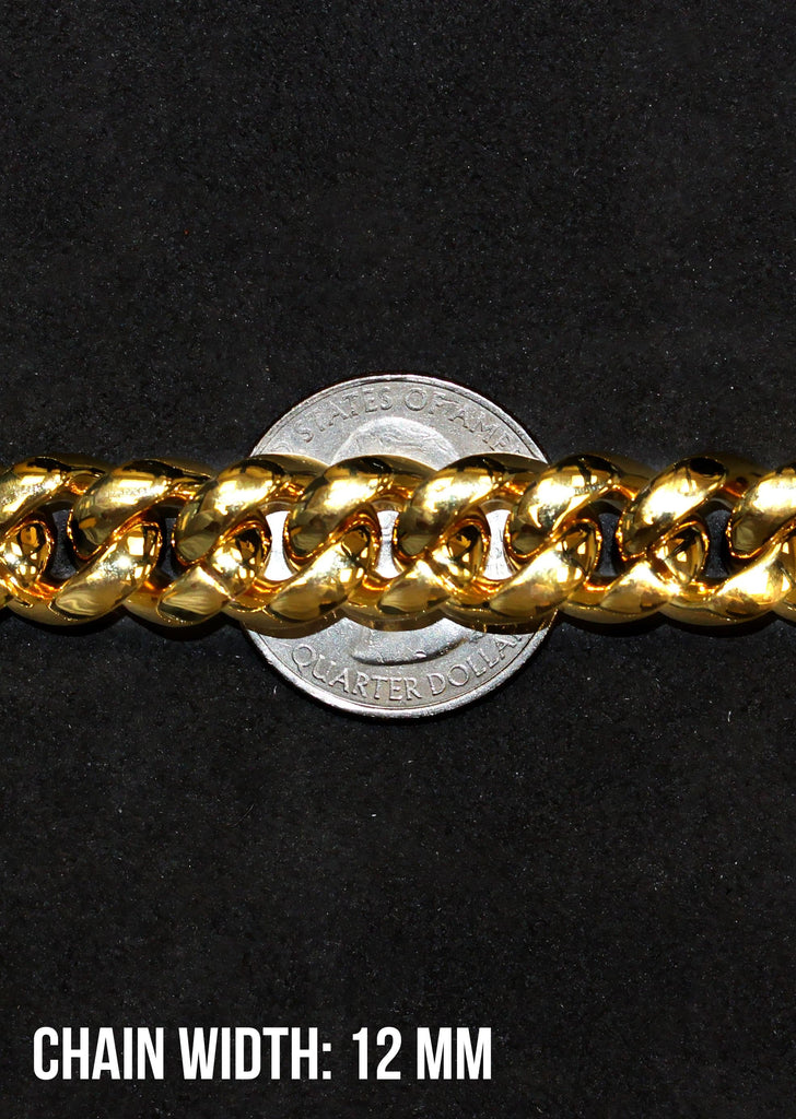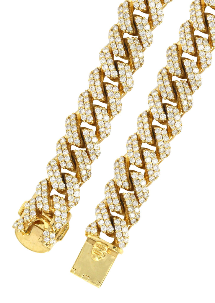 14K Iced Out Diamond Solid Miami Cuban Link Chain 12 Mm Width. You can pick your length above. Once you selected your length, you can see the adjusted gram weight above the price. The quality of the diamonds are VS Clarity and G/H Color.