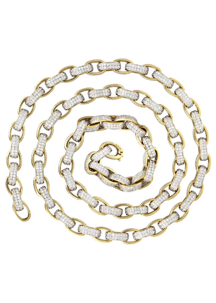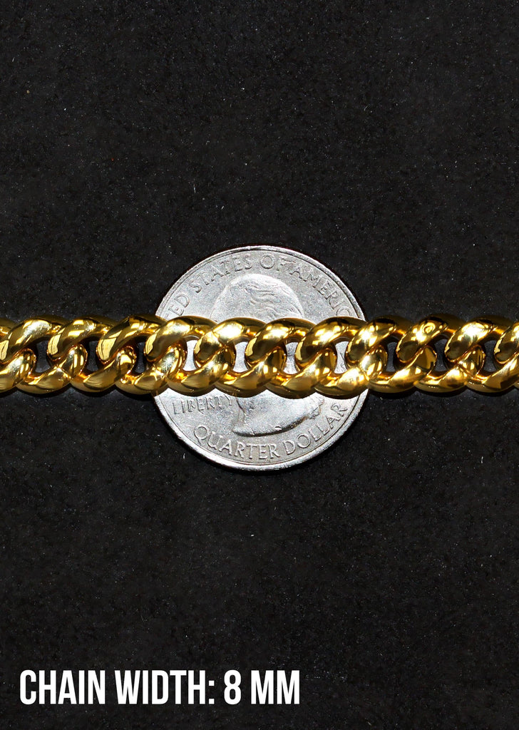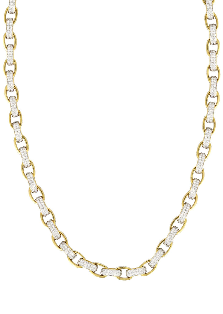14K Gold Iced Out Hermes Chain 8 Mm Width. You can pick your length above. Once you selected your length, you can see the adjusted gram weight above the price. The quality of the diamonds are VS Clarity and G/H Color.