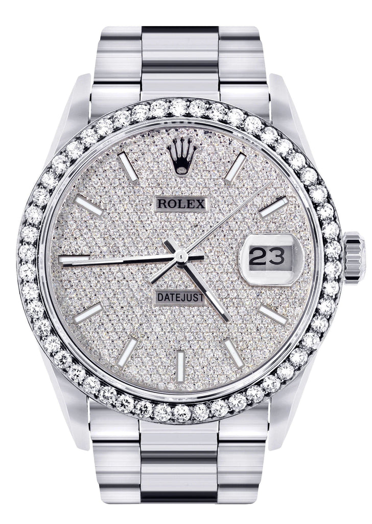 Iced Out Rolex Datejust 36 MM | Stainless Steel | 16.5 Carats of Diamonds | Full Diamond Color Arabic Diamond Dial | Oyster Band